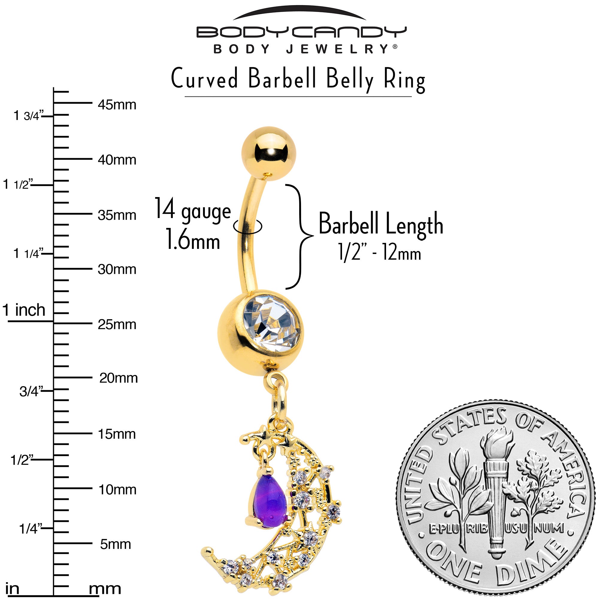 The moon is said to be made of cheese but it's made of stars on this 14 gauge navel ring. It's made with a 3/8 inch gold tone plated over 316L surgical grade stainless steel curved barbell with a 5mm top ball end. The bottom ball end is 8mm and set with a large clear gem. Dangling from the base is a crescent moon charm with a filigree style, set with clear gems for an appearance reminiscent of a constellation. Dangling from the top point of the moon is a purple gem. With all the stars and moonlight, you're bound to fall in love with this lovely, lunar belly piercing jewelry.