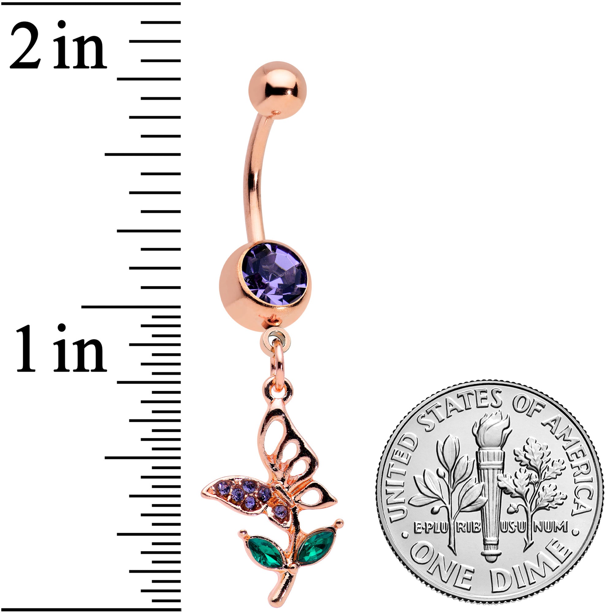 Purple Gem Rose Gold Tone Perching Floral Butterfly Dangle Belly Ring