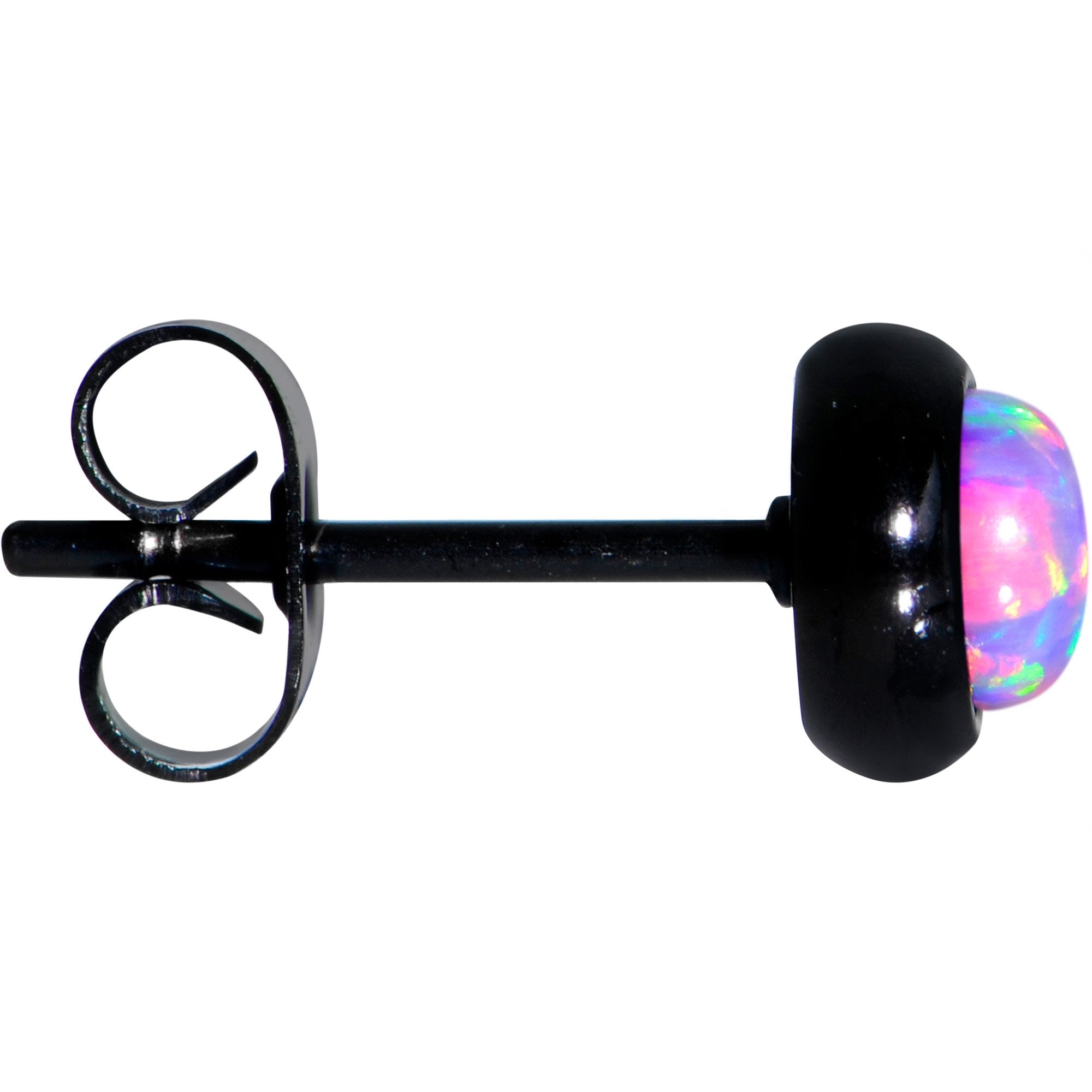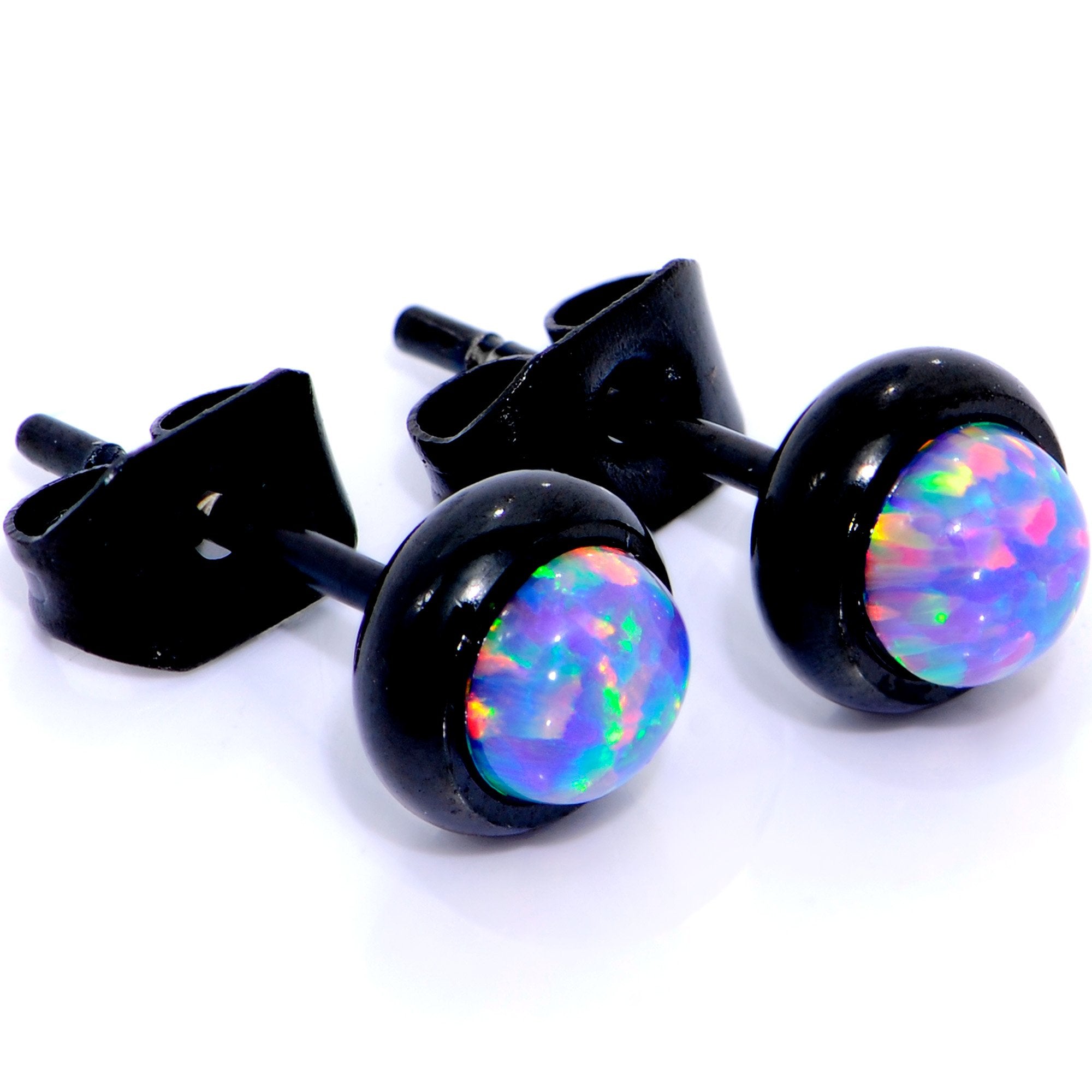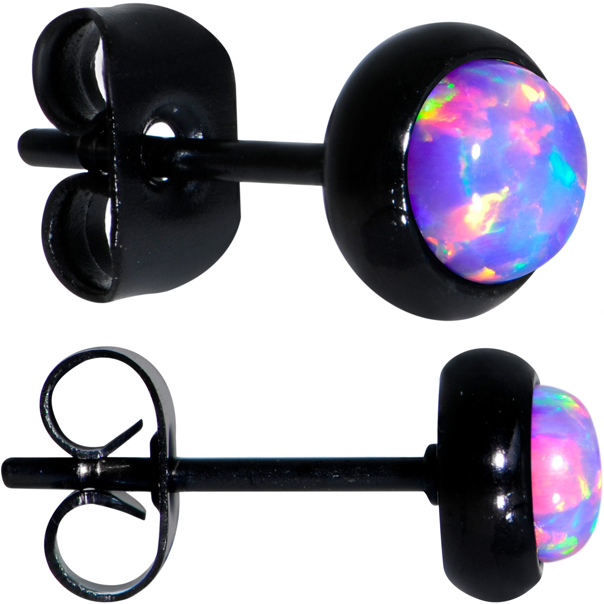 Show off your love of color and cool style when you wear this pair of pretty fashion earrings. Made with black IP over 316L surgical grade stainless steel posts with friction backings, these 6mm diameter earrings for women feature purple synthetic opal inlays.