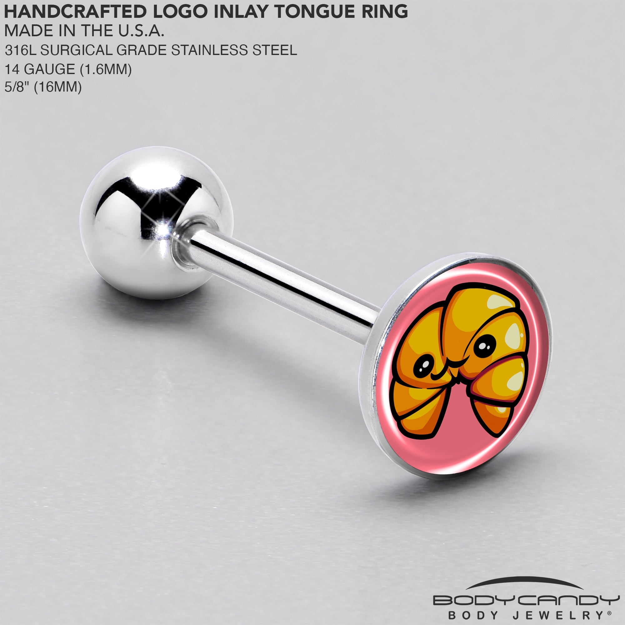 Mmmm, all that buttery flaky style coming from this 14 gauge croissant tongue barbell is enough to make you feel like you're in an elegant cafe with a nice, hot latte. It's made with a 5/8 inch hypoallergenic 316L surgical grade stainless steel straight barbell with a 6mm ball end. This artist hand-drawn croissant tongue piercing ring is the perfect blend of whimsy and elegance, designed to bring a unique touch to your body piercing jewelry collection. With its creative and delicious looking croissant charm, it's a fun way to express your personality while enjoying high-quality body piercing jewelry. Whether you're looking for a tasty tongue piercing barbell or just want to look extra-yummy, this tongue piercing jewelry is sure to hit the spot.