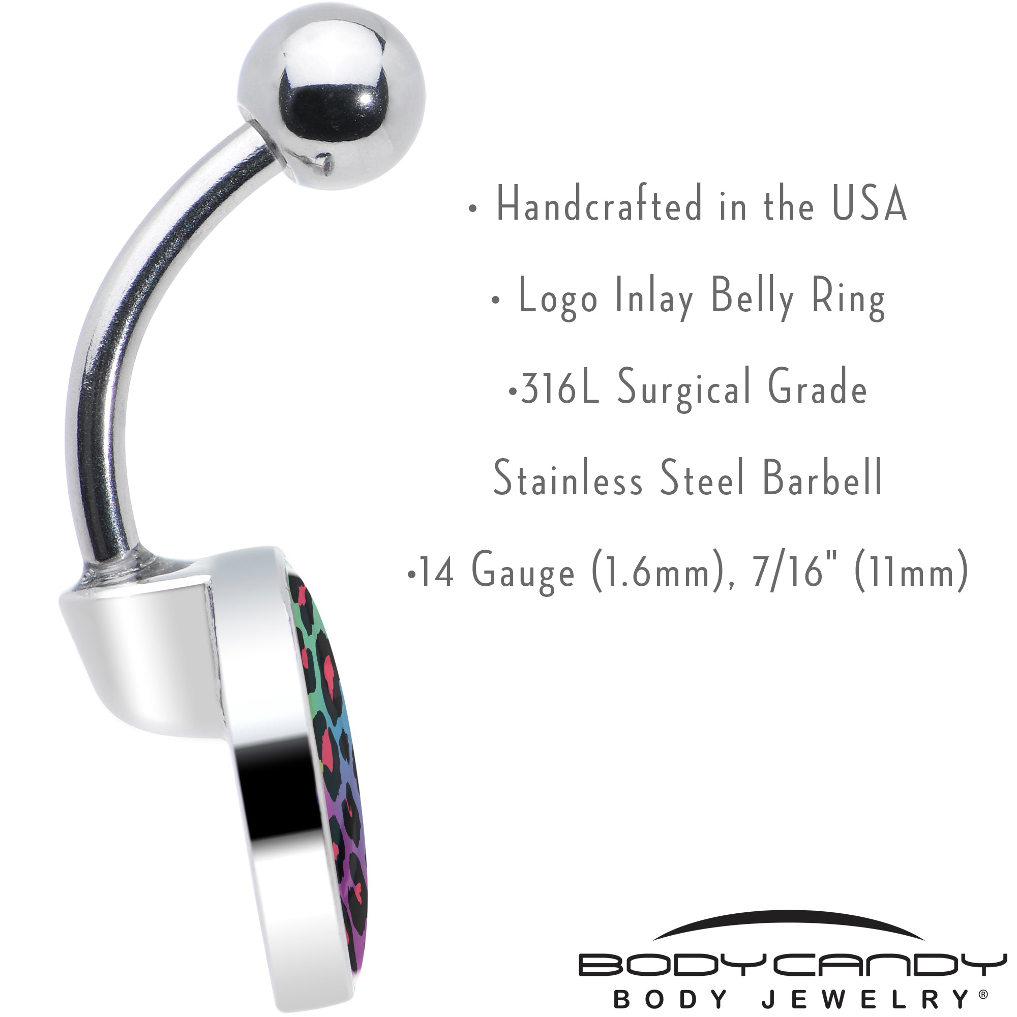 Get a little wild with this colorful 14 gauge cheetah print belly button ring. This cheetah animal print belly ring is made with a 7/16 inch hypoallergenic 316L surgical grade stainless steel curved barbell with a 5mm top ball end. The bottom charm features a vibrant rainbow color to showcase your wildly colorful side. This hypoallergenic 316L surgical grade stainless steel belly ring body jewelry is perfect for anyone with sensitive skin. This eye-catching piece showcases a unique artist-drawn logo insert that will have you ready to roar.