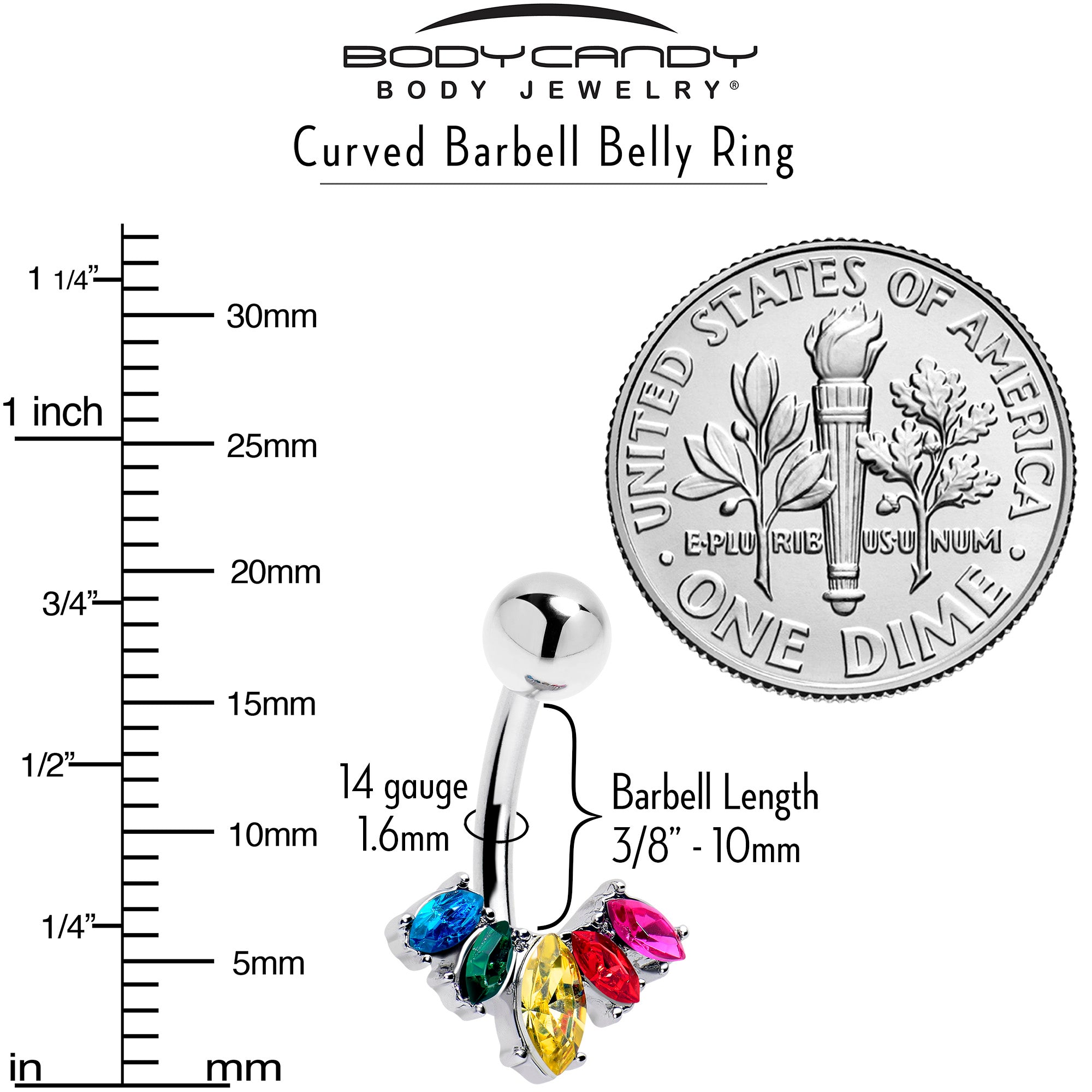 Love comes in every color of the rainbow on this 14 gauge navel ring. It's made with a 3/8 inch 316L surgical grade stainless steel curved barbell with a 5mm top ball end. The bottom end features a rainbow charm. The rainbow is composed of gems in blue, green, red, and pink, with the yellow one features as the center. Show off a rainbow of love with this colorfully glamorous belly piercing jewelry.