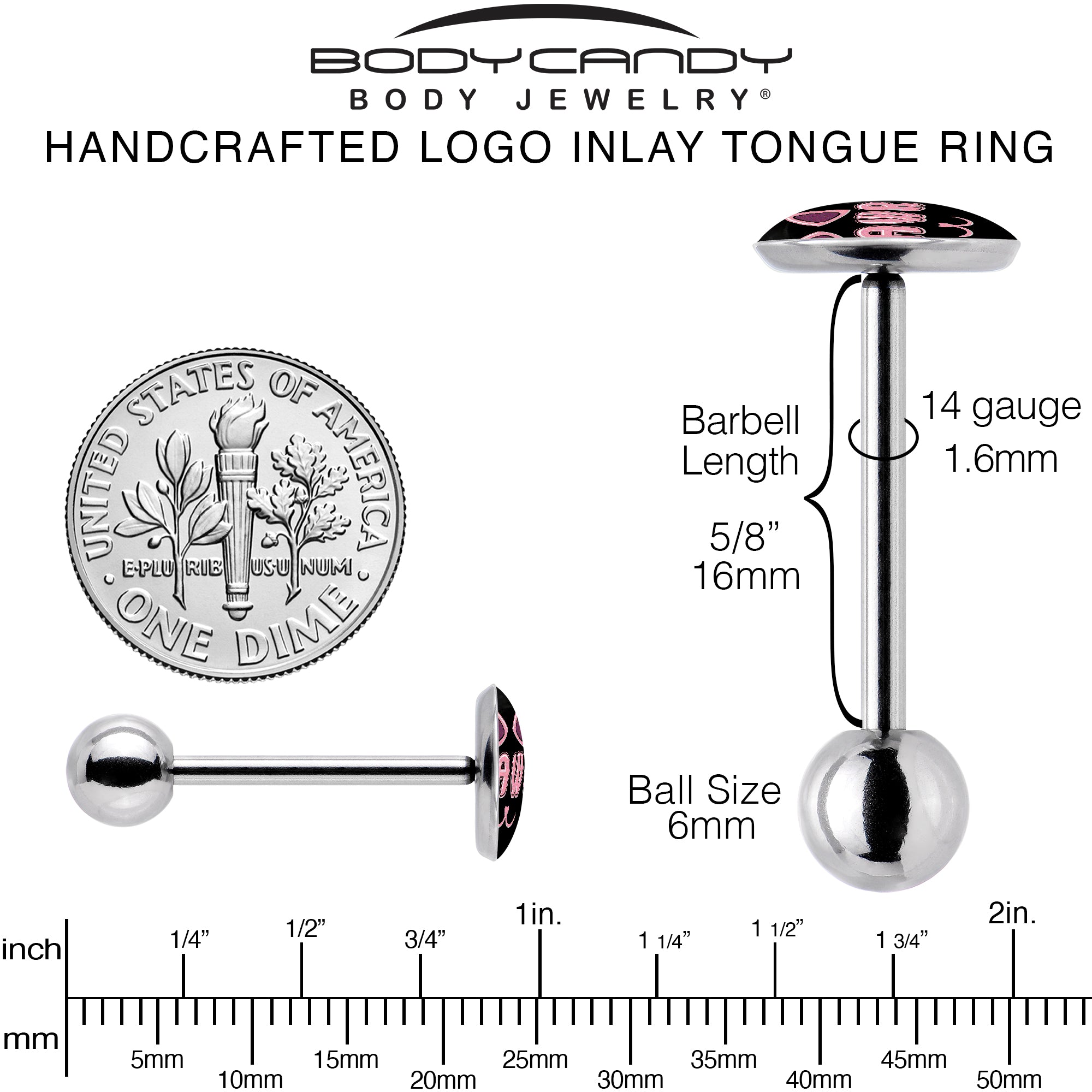 A happy purr is nice, but a mighty rawr rocks when you're wearing this 14 gauge tongue ring. It's made with a 5/8 inch 316L surgical grade stainless steel straight barbell with a 6mm bottom ball end. The top end features a black background and has a cat's ears, nose, and grinning mouth, with the word "RAWR" across the eyes. Let your style roar like a mighty feline with the sweet kitty on this stylish tongue piercing jewelry.