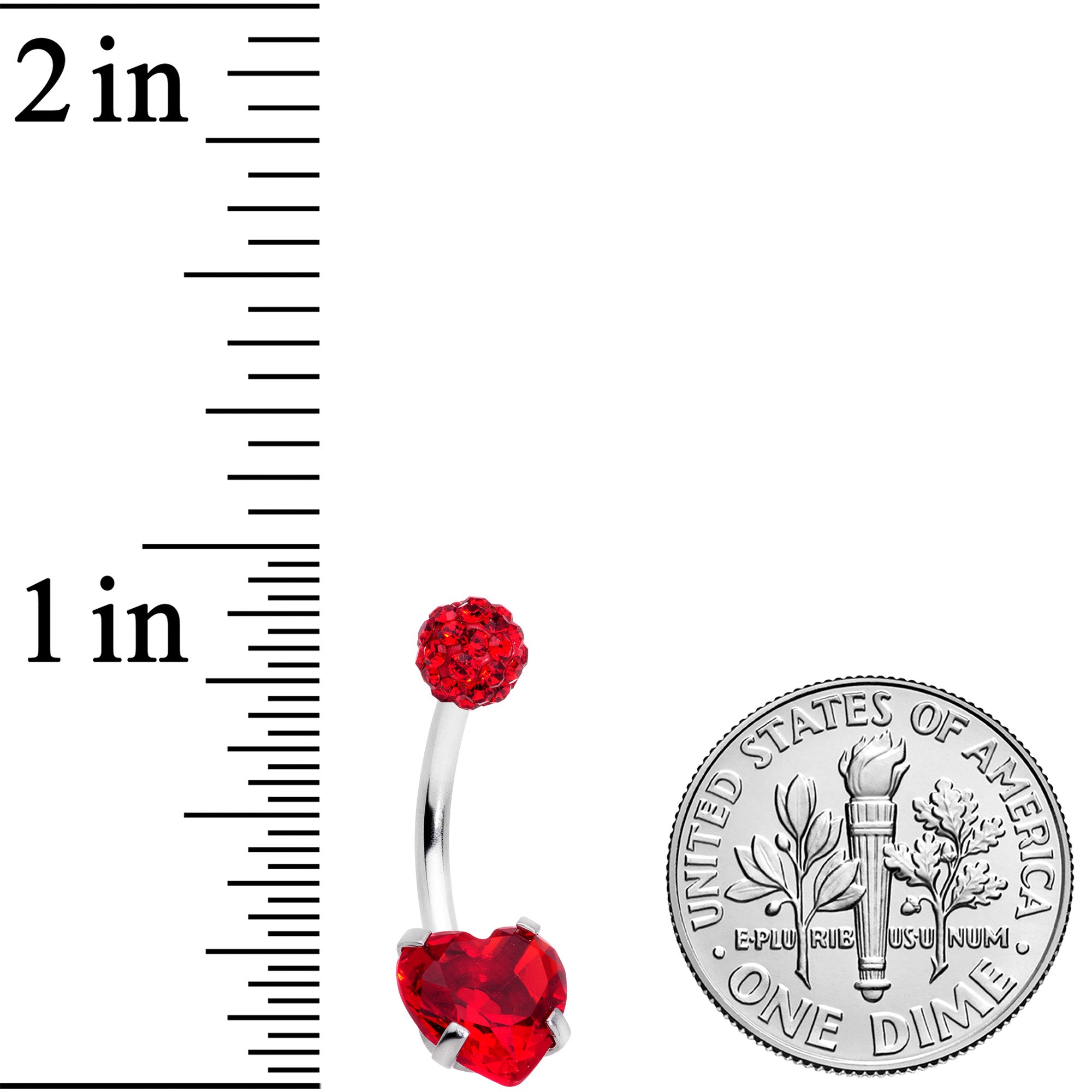 The simple styling and punchy color of this 14 gauge navel ring will be sure to win your heart! It's made with a 3/8" durable 316L surgical grade stainless steel curved barbell. The 5mm top ball end is set with red gems for a look that's reminiscent of the disco era. The bottom end features a red cubic zirconia heart charm! Grab some bell-bottoms and fall in love... with this disco-inspired belly button jewelry!