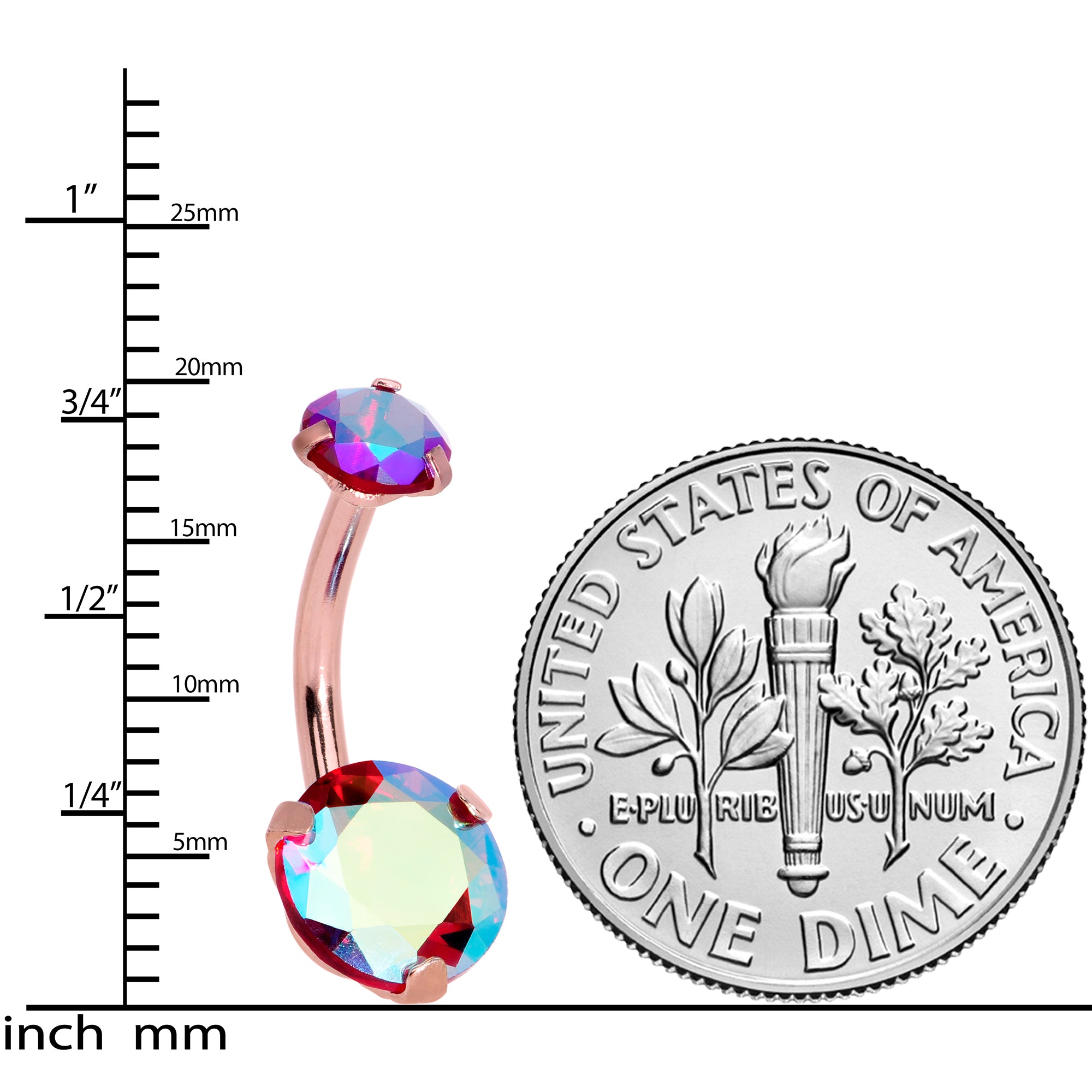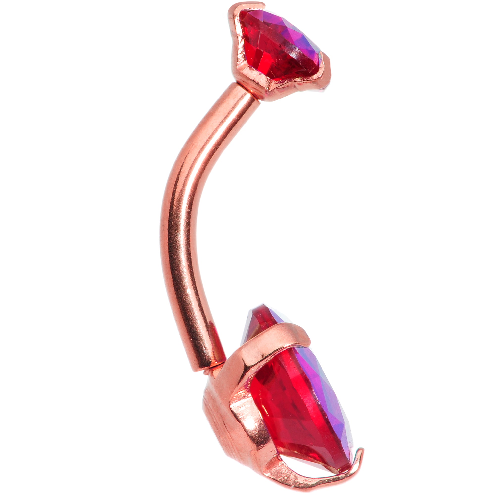 Double the color, double the glamour with this 14 gauge navel ring! It's made with a 3/8" rose gold tone PVD over 316L surgical grade stainless steel curved barbell. The top end is a 5mm red cubic zirconia gem. The bottom end is a matching 8mm red cubic zirconia gem and it's internally threaded for comfortable insertion and removal. The overall look is one of uncomplicated elegance that's both traditional and trendy. If you want it all in one neat package, you want this classy, colorful belly button jewelry!