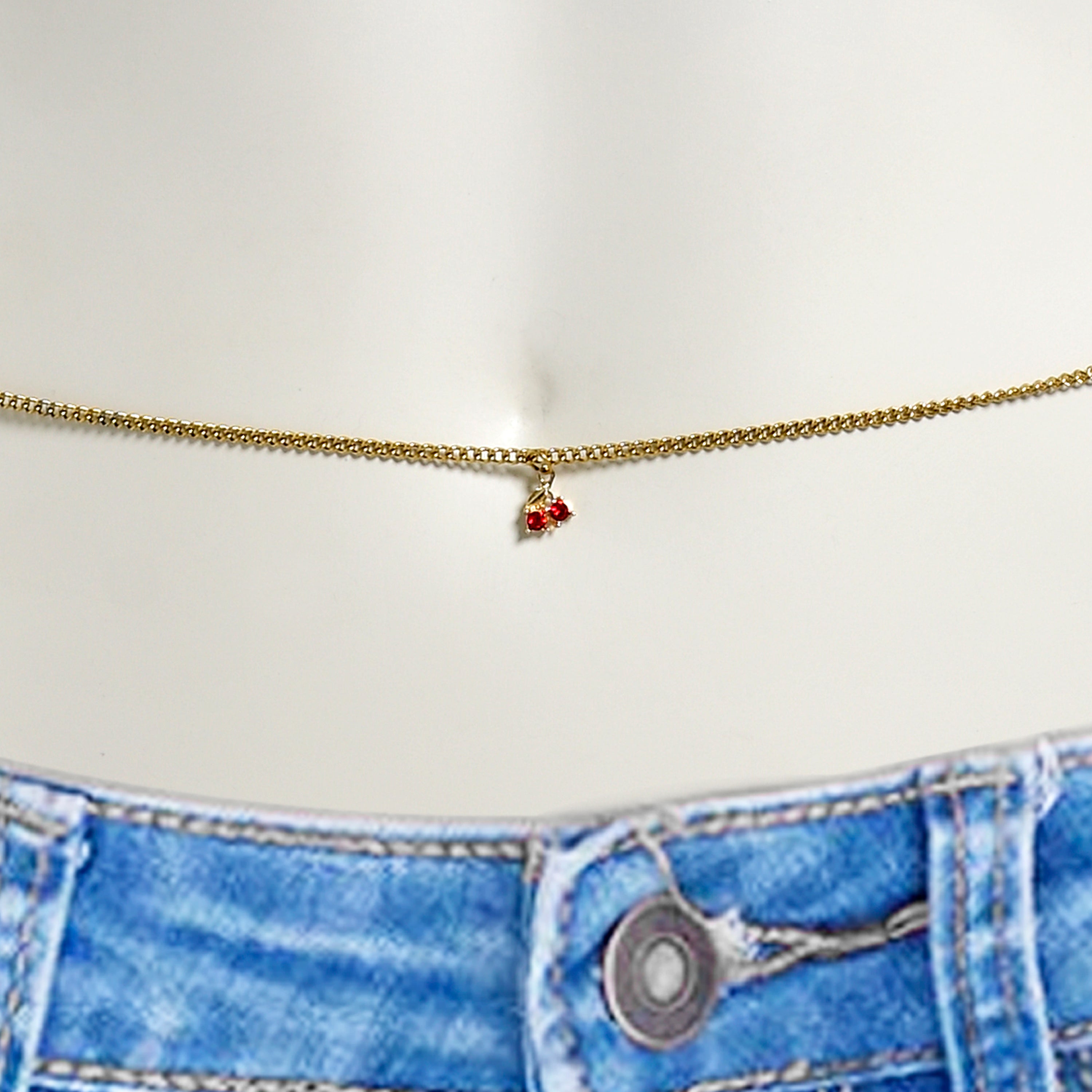 Don't let your midriff go bare when you wear your favorite halter top or belly shirt. This sexy belly chain jewelry is made with gold tone PVD over stainless steel for durable wear. It features a dangle cherries charm embellished with red gems as well as matching red gem embellishments. This belly piercing jewelry features a 29 inch chain length waist belt. The waist chain features a lobster clasp used to adjust the length to fit your body.