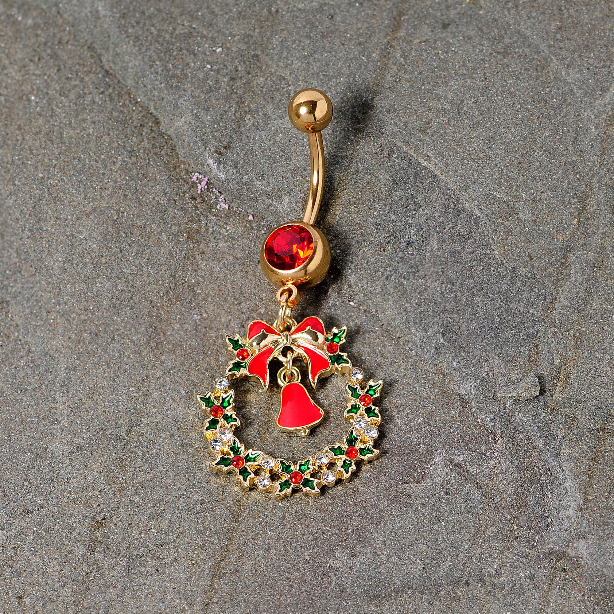 Get into the holiday spirit as soon as you like with this pretty red and green 14 gauge Christmas belly button ring. Made with a 10mm gold tone plated over 316L surgical grade stainless steel curved barbell, this navel ring features a red bottom gem as well as a green Christmas wreath dangle charm with a red bow charm and bell to symbolically ring in the Christmas season.