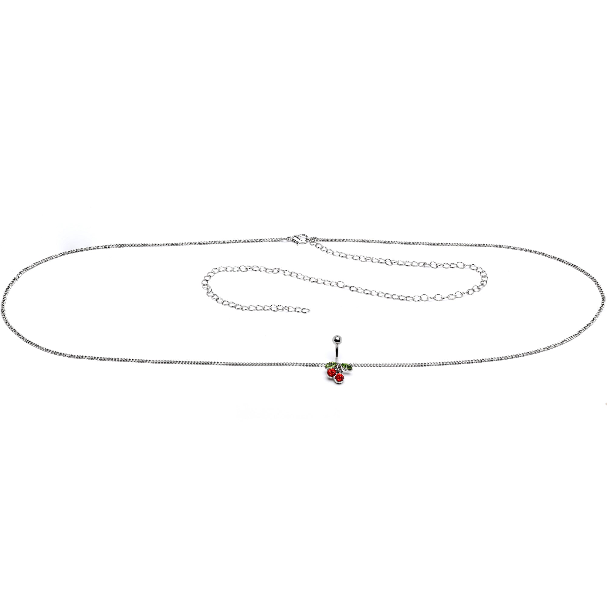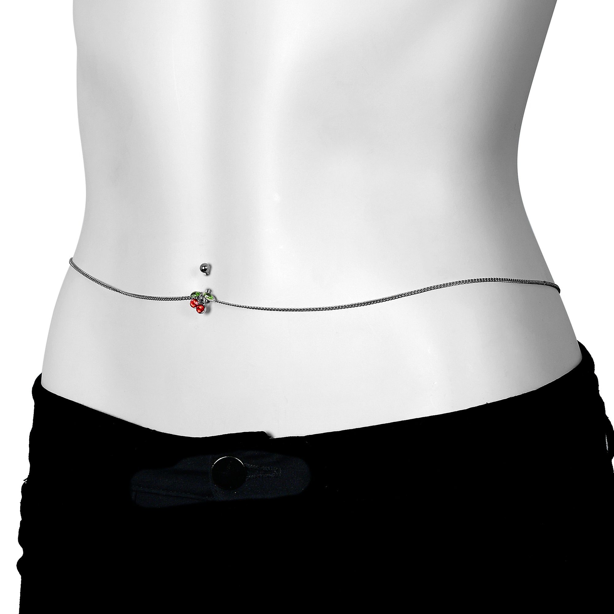 Don't let your midriff go bare when you wear your favorite halter top or belly shirt. This sexy belly chain jewelry is attached to a 14 gauge navel ring made with a 3/8" durable 316L surgical grade stainless steel curved barbell with a 5mm top ball end. The bottom end features a tasty pair of cherries charm, composed of red and green gems. This belly piercing jewelry features a 29.5"-44" chain length waist belt. The waist chain features a lobster clasp used to adjust the length to fit your body.