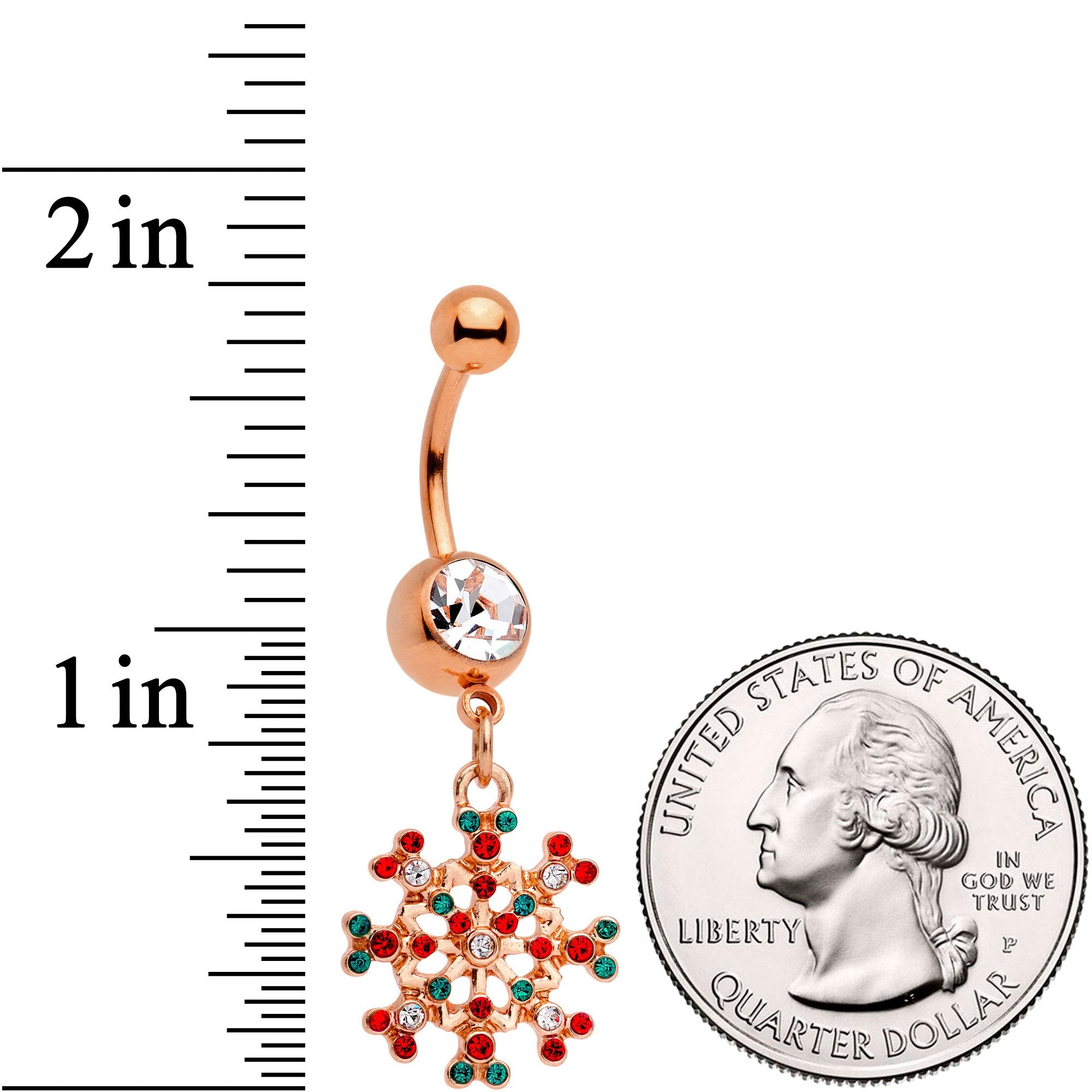 Bet you never thought gems just fell from the sky! Usually, they don't but just this once we've caught some snowflakes and put them on 14 gauge navel rings to preserve forever. Made with a 1/2" rose gold tone plated over 316L surgical grade stainless steel curved barbell, this belly button ring has a clear gem in the 8mm bottom ball end. The snowflake dangle is almost entirely composed of tiny color gems, almost covering the base of the dangle but leaving enough open space so that the body jewelry look luxe. Better get yours before they melt away!