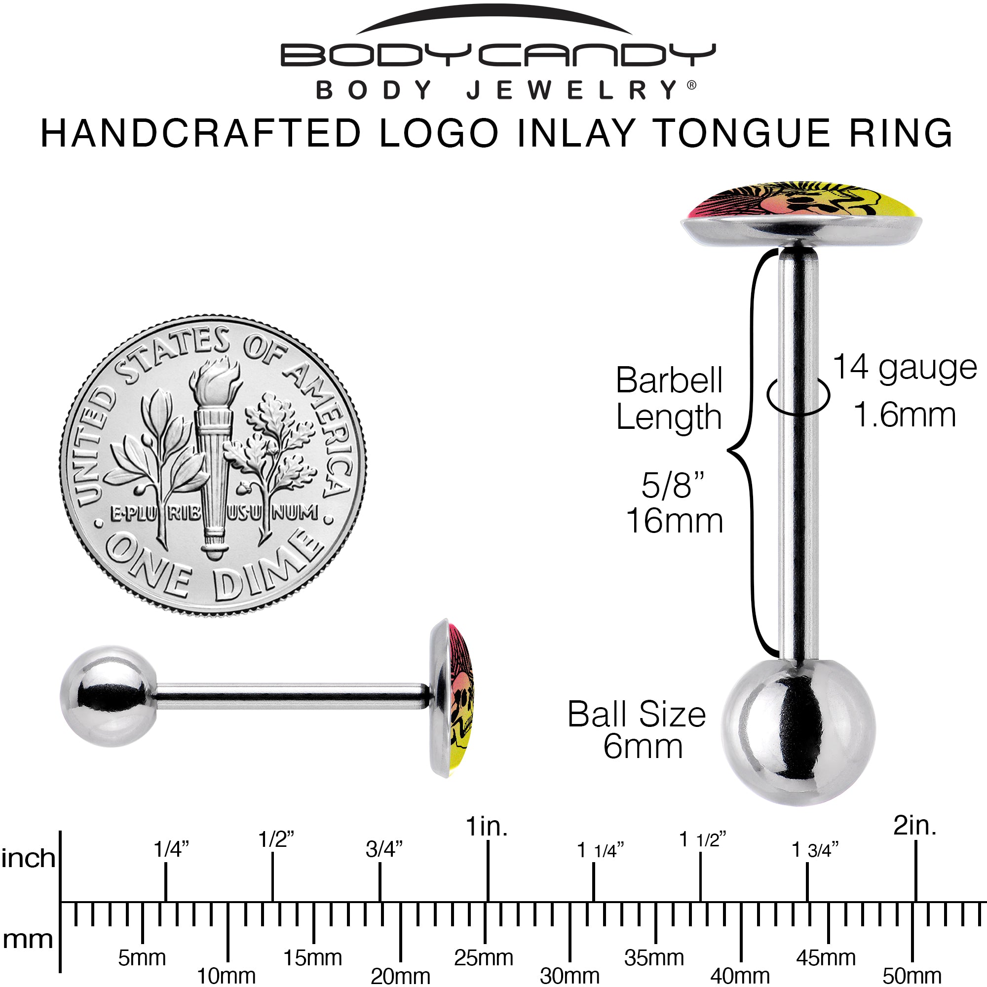 Add some palmy desert style to your look with a creepy twist when you're rocking this 14 gauge tongue barbell. It's made with a 5/8 inch 316L surgical grade stainless steel straight barbell with a 6mm bottom ball end. The top end features a logo disc charm of a silhouetted desert with a red sky, yellow sand, and silhouetted palm fronds. At the center is a simple skull, adding a touch of eerie style to an otherwise peaceful scene. Let your look rest in peace with this sunset skull tongue piercing jewelry.