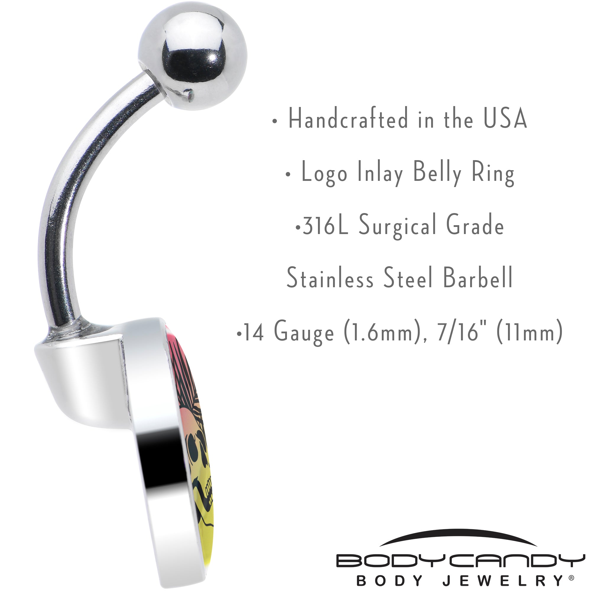 Add some palmy desert style to your look with a creepy twist when you're rocking this 14 gauge navel ring. It's made with a 7/16 inch 316L surgical grade stainless steel curved barbell with a 5mm top ball end. The bottom end features a logo disc charm of a silhouetted desert with a red sky, yellow sand, and silhouetted palm fronds. At the center is a simple skull, adding a touch of eerie style to an otherwise peaceful scene. Let your look rest in peace with this sunset skull belly piercing jewelry.