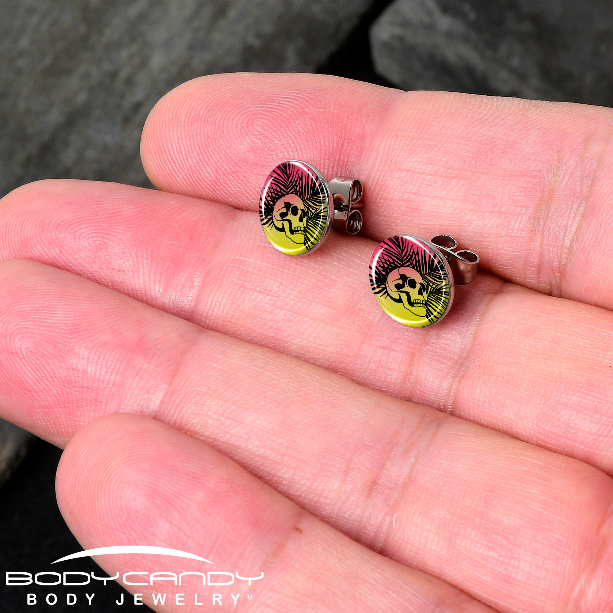 Hypoallergenic jewelry for sensitive skin.Red Haze Sunset Skull and Palms Stud Earrings