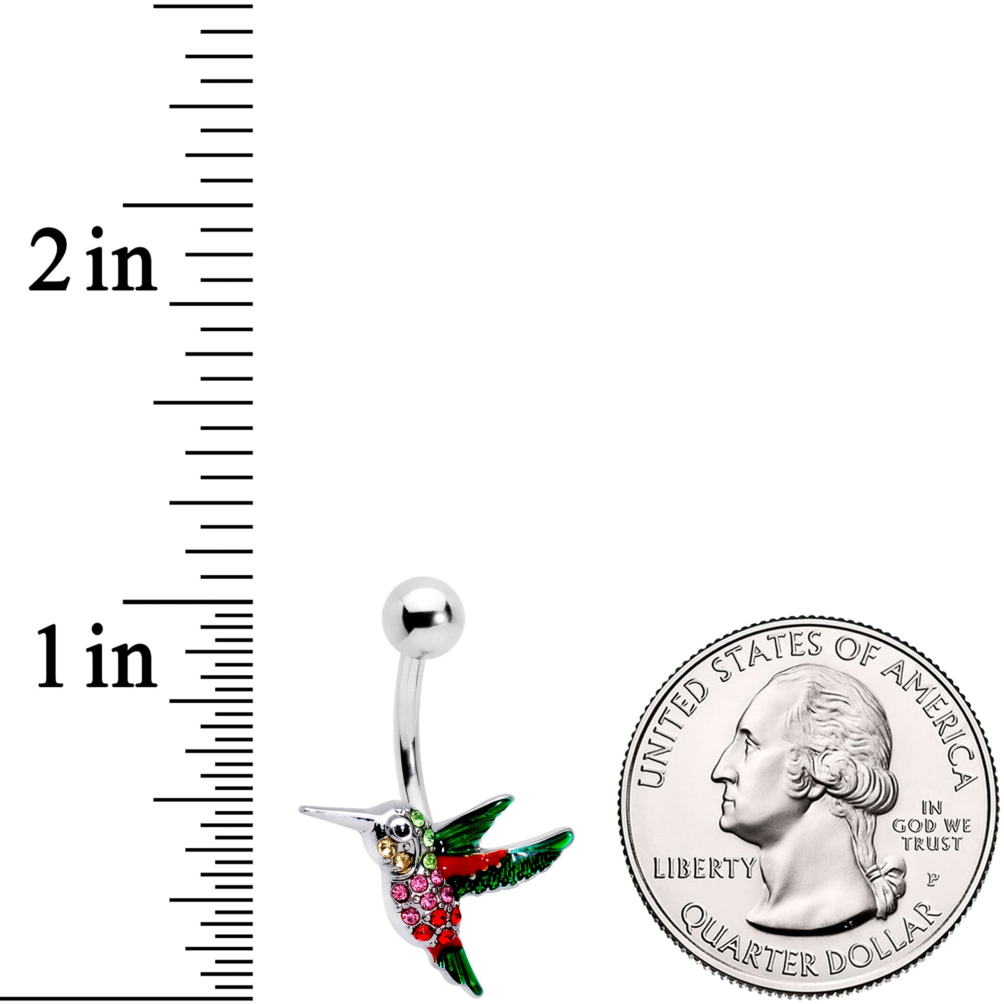 Hummingbirds love sweet nectar....and in return they'll make your belly piercing look super sweet with this 14 gauge navel ring! It's made with a 3/8" durable 316L surgical grade stainless steel curved barbell with a 5mm top ball end. The bottom end features a little hummingbird charm, set with red and pink gems for a look of opulence. It's further embellished in green for a stunning color contrast, and has a black gem eye for a realistic touch. This little hummingbird is sure to make your heart flutter and soar with its beauty!