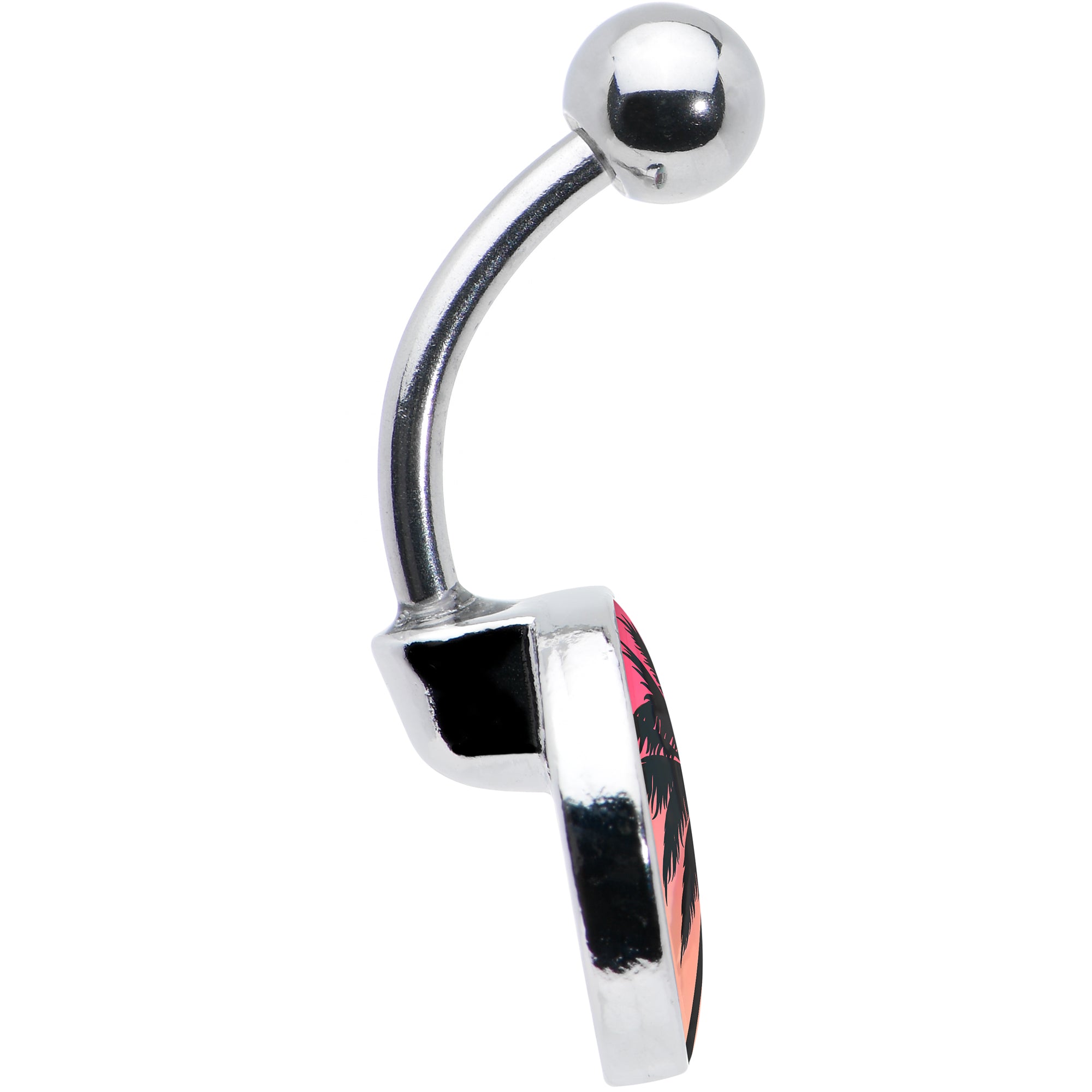 Have a hot night in the tropics from anywhere, at any time, with this 14 gauge palm tree navel ring. It is made with a 7/16 inch 316L surgical grade stainless steel curved barbell with a 5mm top ball end. The bottom end features a silhouetted palm tree charm with birds against a sky that is all rich reds and sunset orange. You will practically feel the ocean breeze when you are rocking this tropical sunset palm tree belly piercing ring.