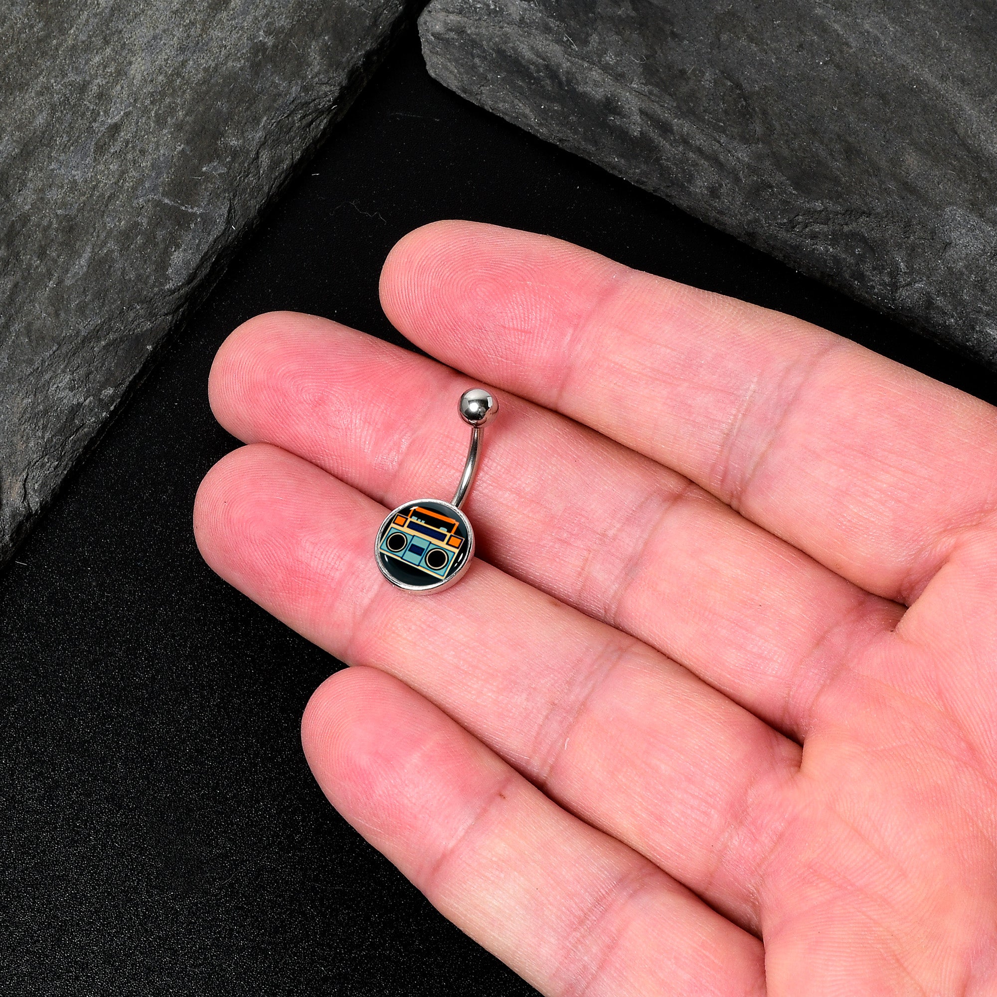 Pump up the jams with this 14 gauge navel ring! It's made with a 7/16" durable 316L surgical grade stainless steel curved barbell with a 5mm top ball end. The disc shaped bottom end features an 80's style boombox charm. The boom box is blue with orange detailing for visual contrast you can't help but notice. Rock out your piercings old-school with this refreshingly retro belly piercing ring!