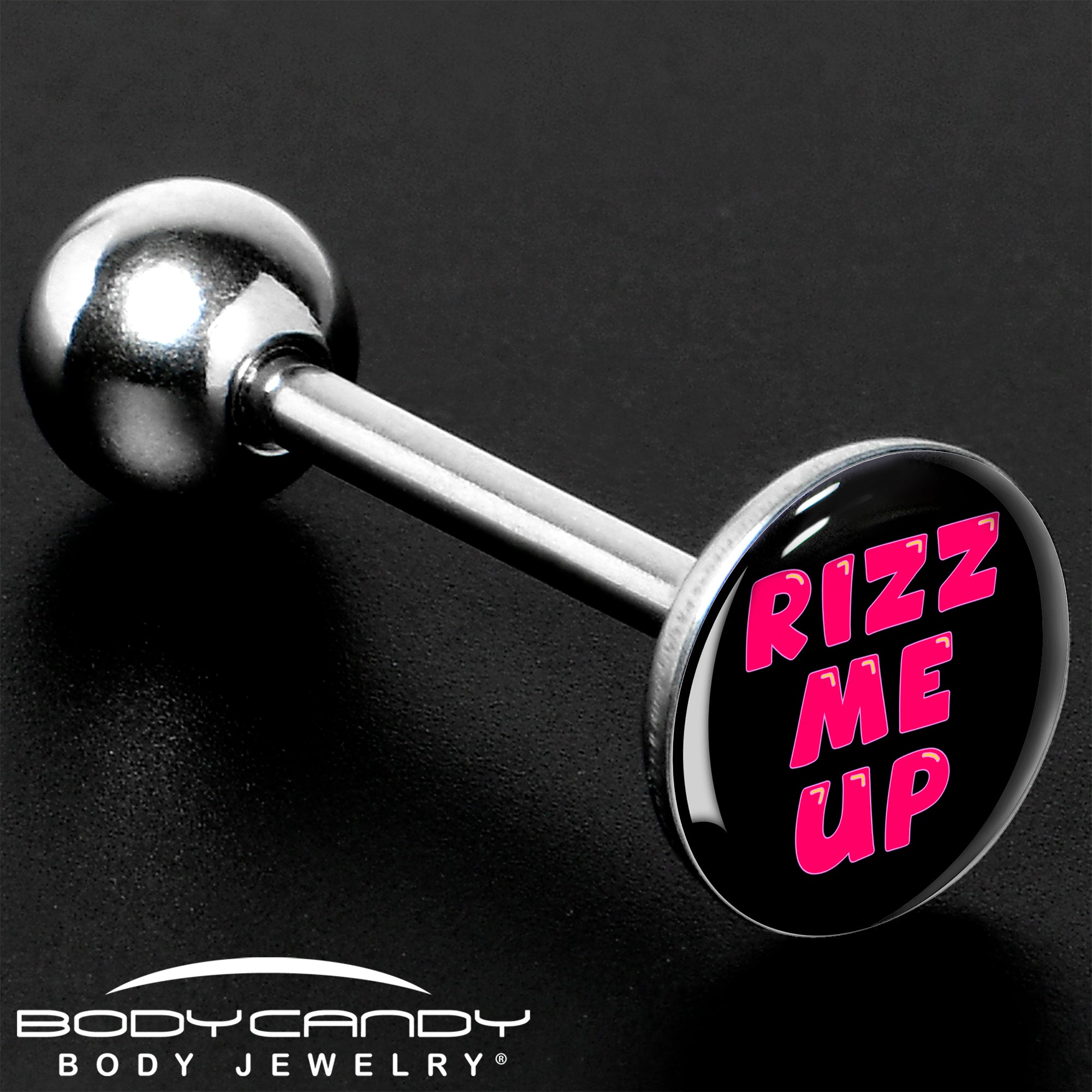 If you need a little rizz, let the world know with this 14 gauge tongue barbell. It's made with a 5/8 inch 316L surgical grade stainless steel straight barbell with a 6mm bottom ball end. The top end features a disc shaped charm with the words rizz me up in a slick looking font that is sure to get noticed. Express your needs and get seen with this tongue piercing jewelry which is full of charisma on its own.