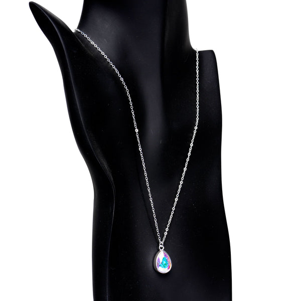 This handcrafted necklace features a purple charm that looks like a drop of pristine rainwater from a fluffy cloud. The perfect raindrop charm is created with crystals and features a silver plated frame. The purple crystal hangs from an 18" silver plated cable chain featuring a lobster clasp closure. Handmade in the USA.
