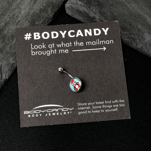 Get chill for the holidays with the sweet snowy penguin on this 14 gauge navel ring! It's made with a 7/16" durable 316L surgical grade stainless steel curved barbell with a 5mm top ball end. The bottom end features a penguin charm. The penguin is sporting a red Santa hat and matching scarf, and is chilling against a snowy background. You'll be ready to chill for the holidays too with this sweet and festive penguin belly piercing ring.