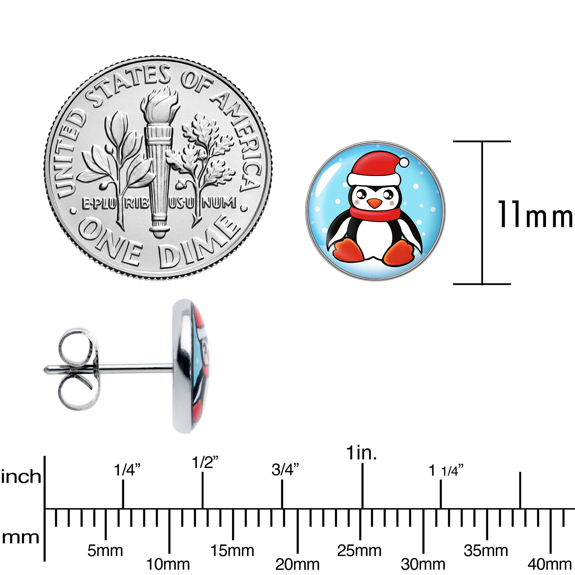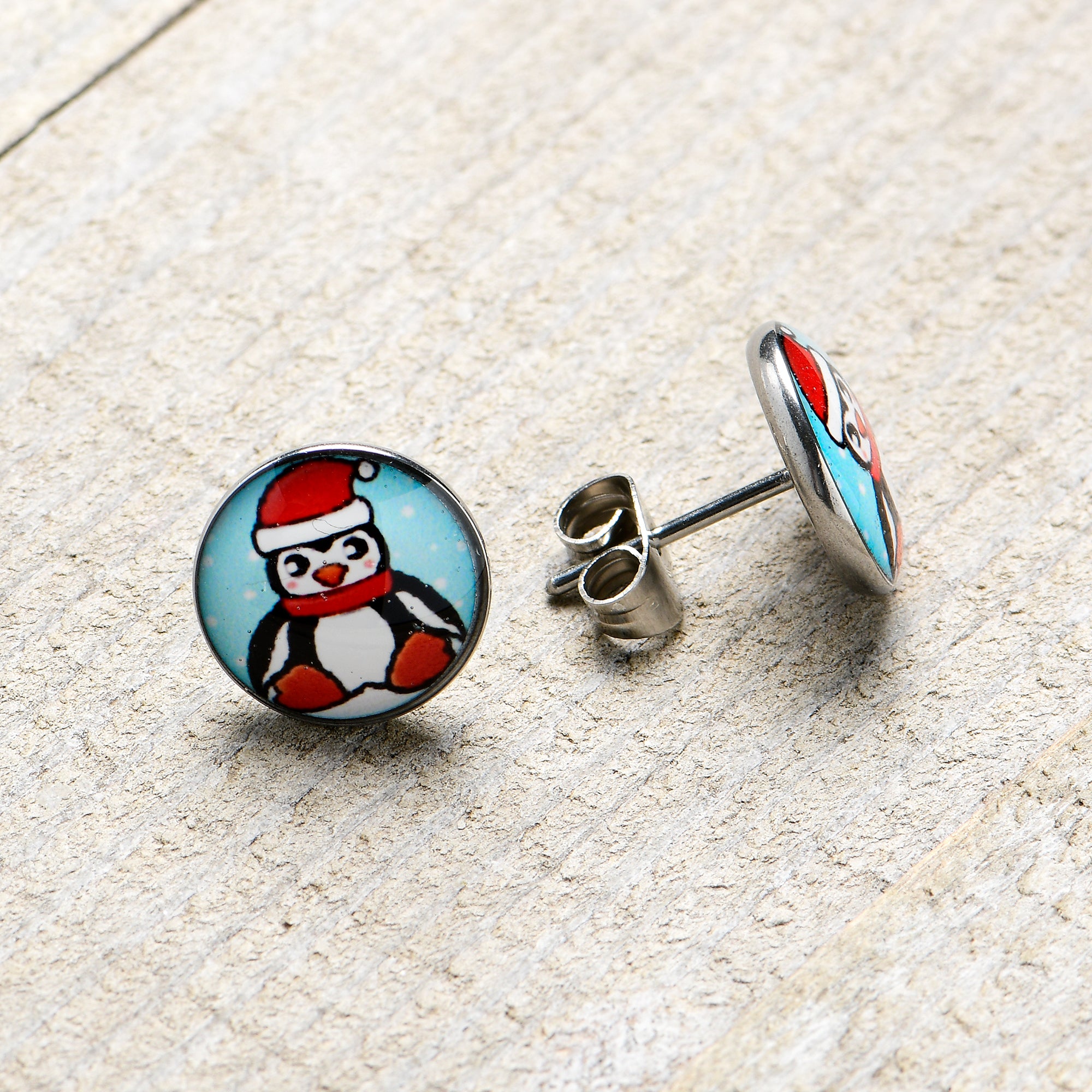 Get chill for the holidays with the sweet snowy penguins on these earrings for pierced ears! They're made with stainless steel straight posts with friction backs for a secure fit. Each one features a penguin charm. The penguins are sporting red Santa hats and matching scarves, and are chilling against a snowy background. You'll be ready to chill for the holidays too with these sweet and festive penguin stud earrings. Sold as a set of two.