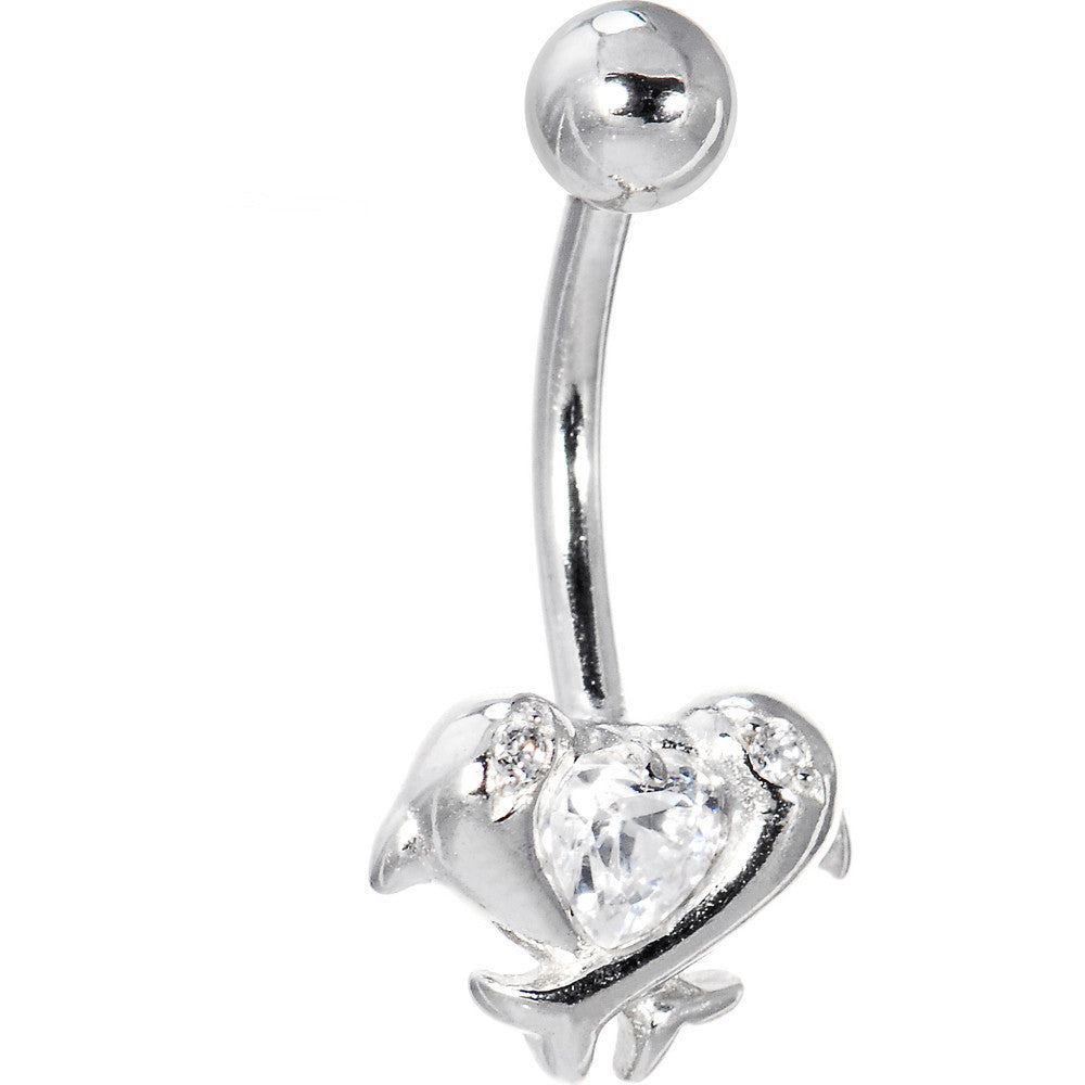 Two sleek dolphins embrace a sparkling cubic zirconia, creating a charming, symbolic centerpiece for your belly piercing.