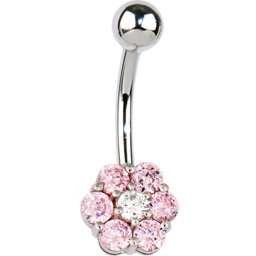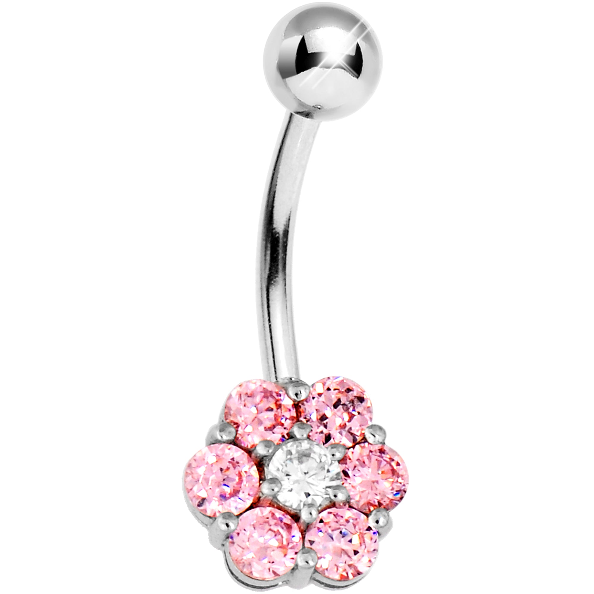 Solid 14k White Gold Pink Cubic Zirconia Flower Belly Ring