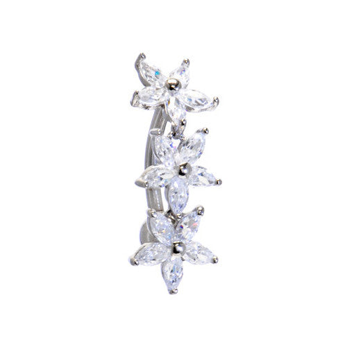 Elevate your style with this stunning 16-gauge belly ring, crafted from solid 14KT white gold for a touch of timeless elegance. Designed with a top-mount style, this piece features a trio of dazzling cubic zirconia lily flower charms that delicately dangle for added movement and sparkle.