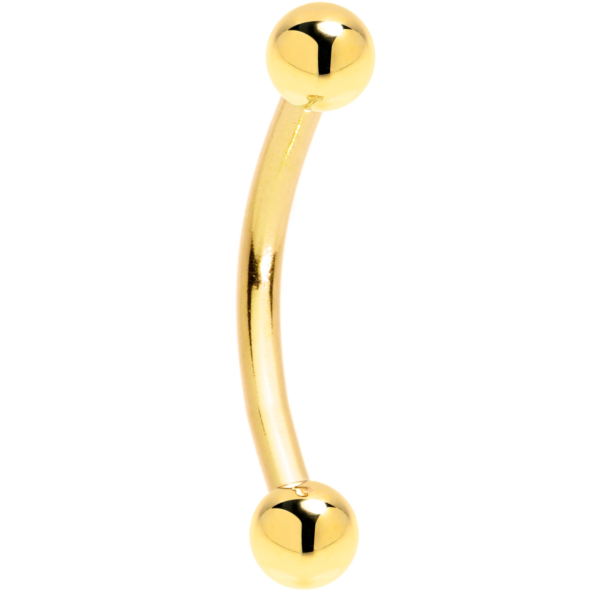 Classic Solid 14KT Gold Curved Barbell in 16 Gauge. 16 gauge solid gold curved barbell in a 10mm length with external threading. 16 Gauge 3/8 Solid 14k Gold Curved Barbell Piercing can be worn as an eyebrow ring, earring such as a rook piercing or even for a vertical labret piercing.