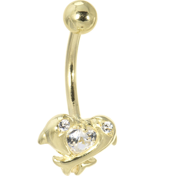 16G Solid 14k Yellow Gold Cubic Zirconia Dolphin Kiss Belly Ring