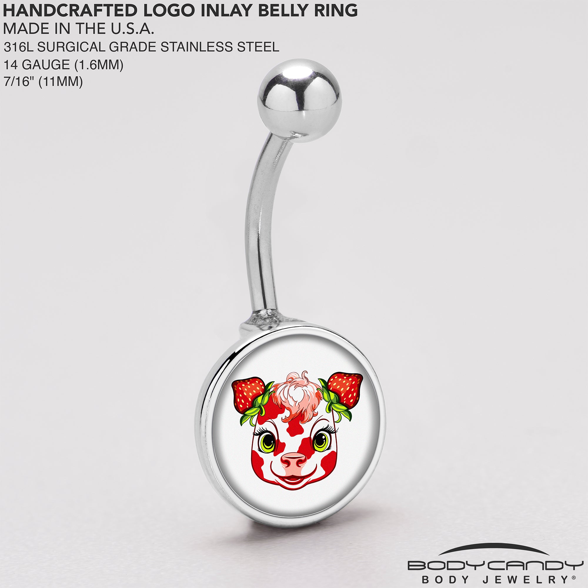 This cow looks so tasty you'll be wanting moooore on this 14 gauge navel ring. It's made with a 7/16 inch 316L surgical grade stainless steel curved barbell with a 5mm top ball end. The bottom end features a cow charm. The cow features a delightful and delicious looking strawberry pattern that you can't resist. You'll be looking sweet and tart and stealing hearts with this strawberry cow belly piercing jewelry.