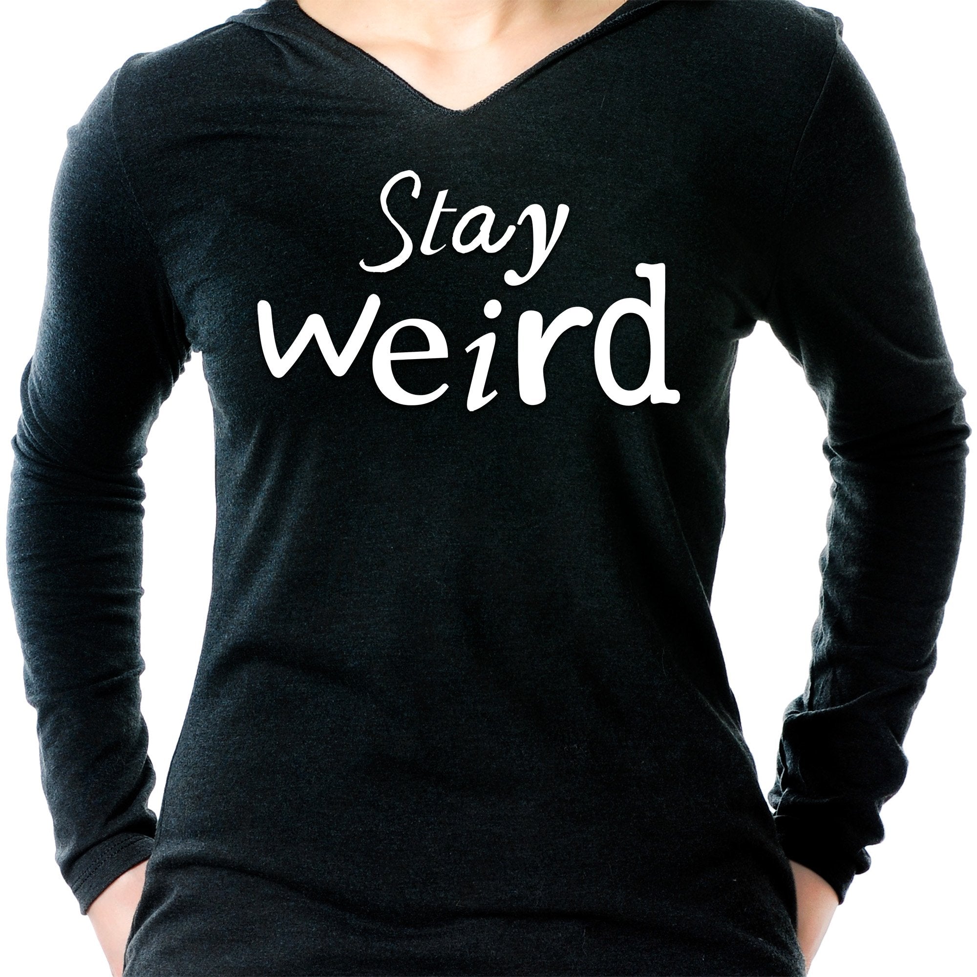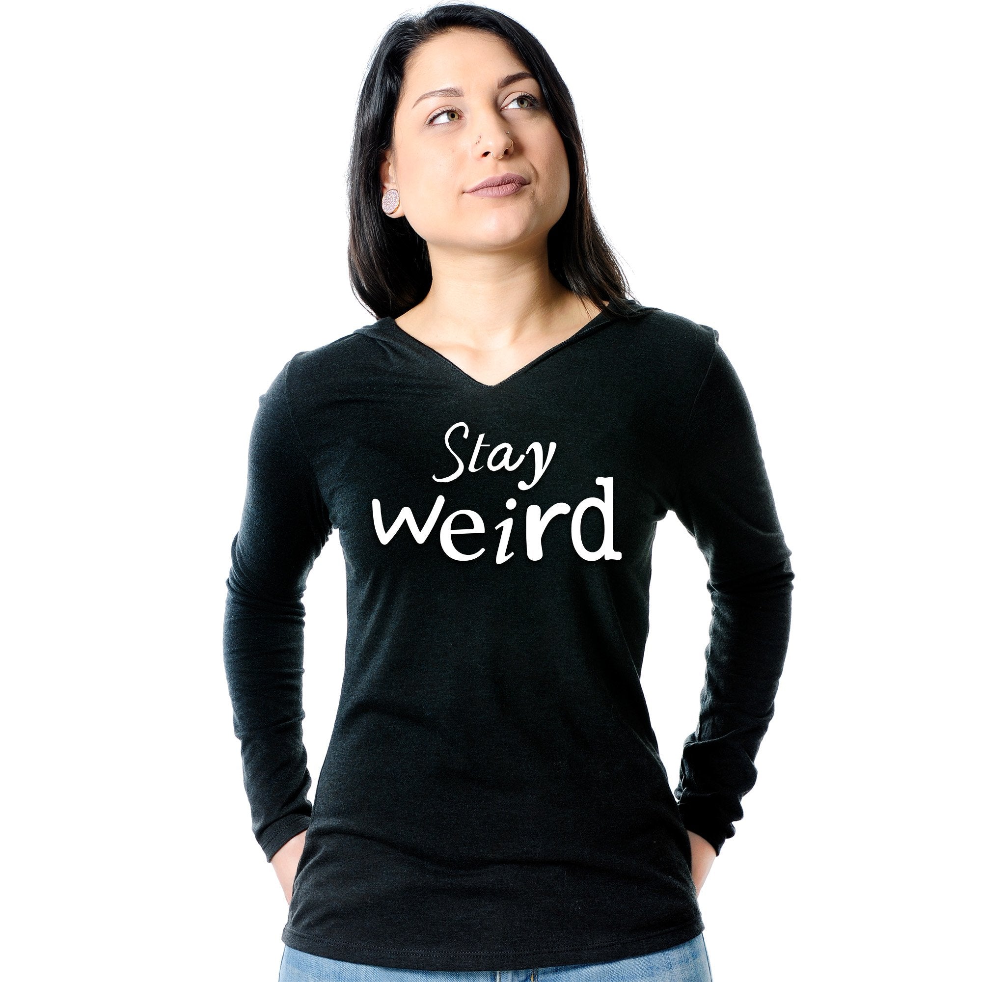 Let the world know that you want to keep things weird whenever you wear Body Candy's 50/25/25 poly/ring spun combed cotton and rayon "Stay Weird" v-neck hoodie. This soft and comfortable hoodie features shoulder to shoulder taping, a split v-neck with raw edge, and has a fitted style and is lightweight that is the perfect fusion of lightweight comfort and carefree style, combined into this fashionable pullover hoodie for women. The tri-blend fabric features colors that have a unique character and may have subtle variations in color.