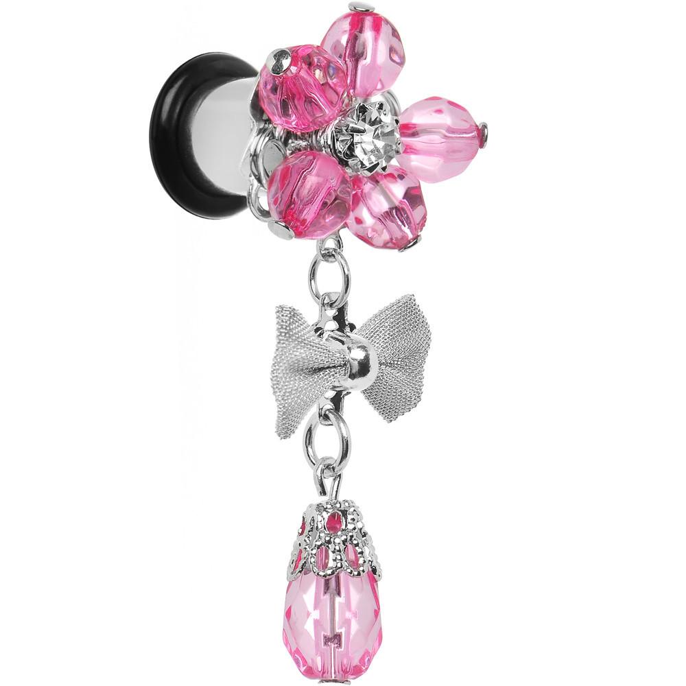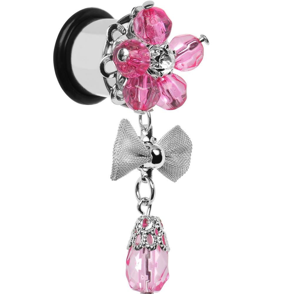 Sold individually, purchase 2 for a pair. Ear expander plug. Blooming Flower Plug body jewelry with sparkling gem center. Stainless steel hollow tunnel ear plug fashioned with a mesh bow and fancy faceted dangle. Dangle charm ear plug.
