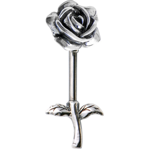 Sterling silver nipple barbell. This nipple ring is designed with a surgical steel barbell and sterling silver ends featuring a rose bud and stem. Rose nipple ring. (Item sold individually)