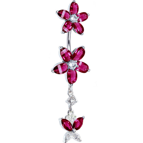 Sterling Silver 925 Siam Red Cubic Zirconia Dual Lily Butterfly Belly Ring