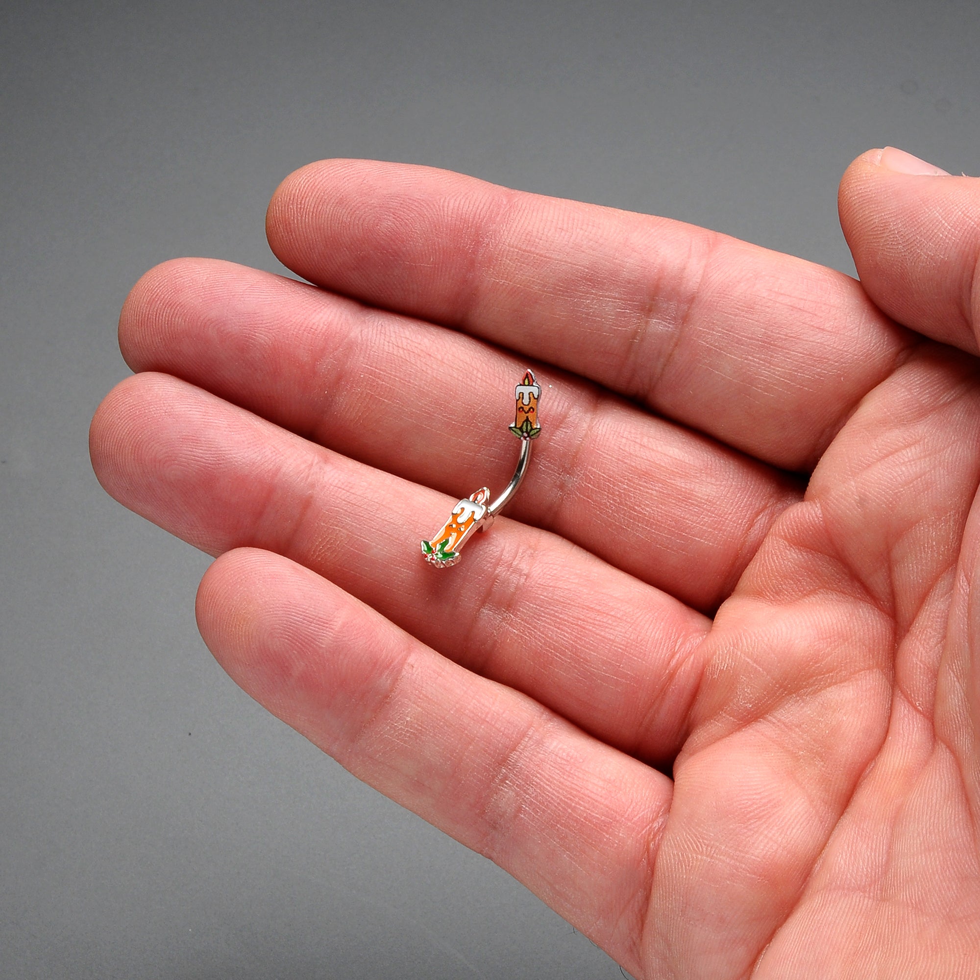 Keep the light in your piercings with this 14 gauge navel ring! It's made with a 3/8" durable 316L surgical grade stainless steel curved barbell. Each of the ends features a candle charm, with white embellishment. The candles are further embellished with an inlaid sprig of holly at their bases for a thoroughly festive feel. You'll be feeling the season when you're rocking this fun and festive belly piercing jewelry.