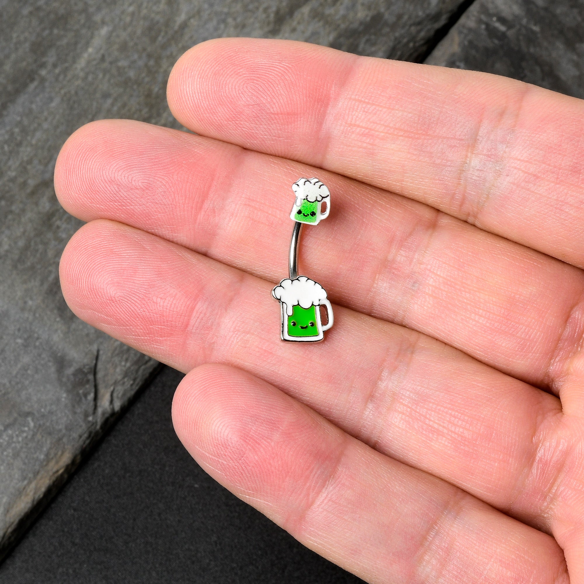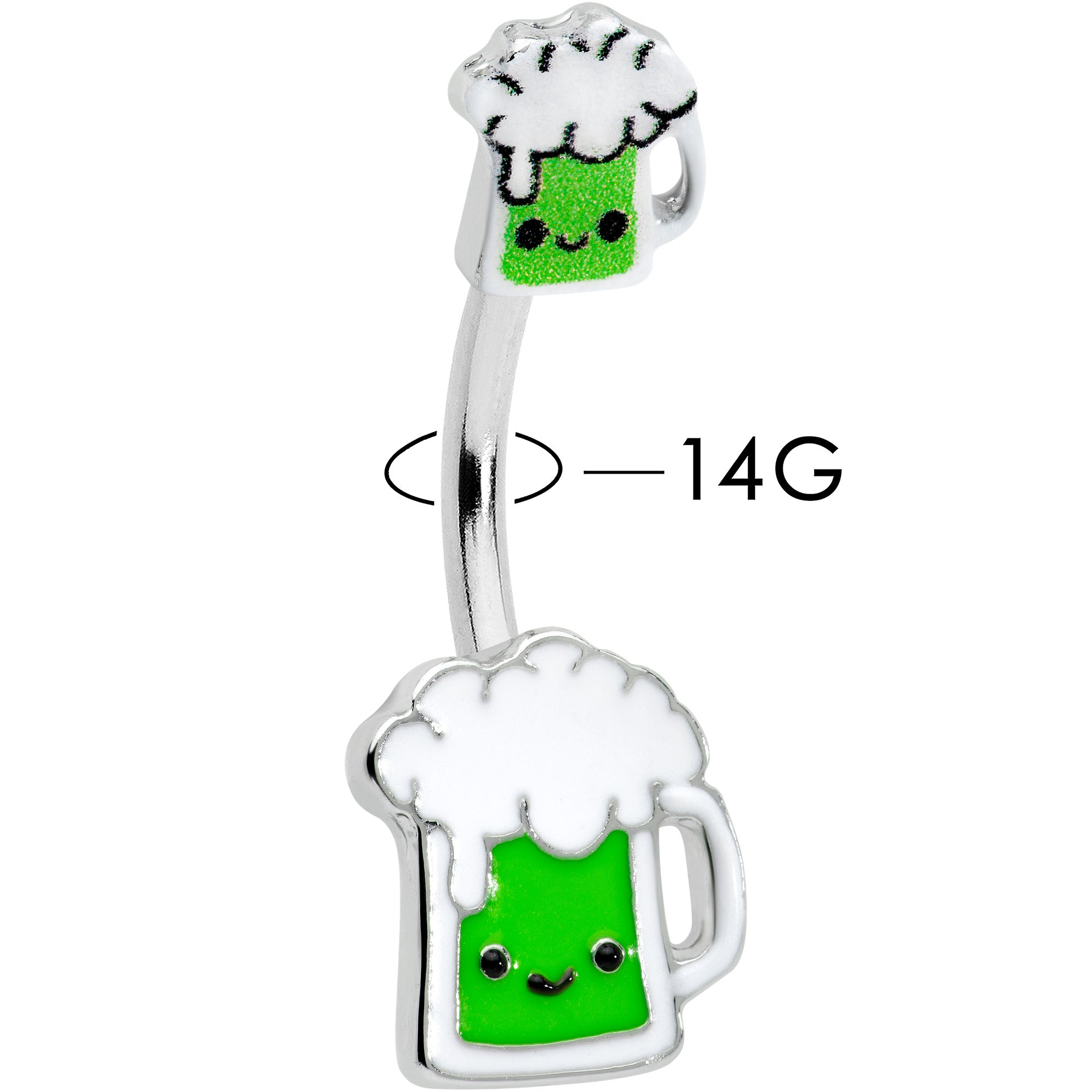 This St Patrick's Day, belly up to the bar with this 14 gauge navel ring! It's made with a 3/8" durable 316L surgical grade stainless steel curved barbell. Each of the ends features a green beer charm, with a happy little face on each one. If you're looking for a bit of green to wear this St. Patrick's Day, have no fear - we've got some beer for your belly piercing with this festive belly piercing jewelry!