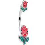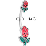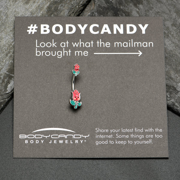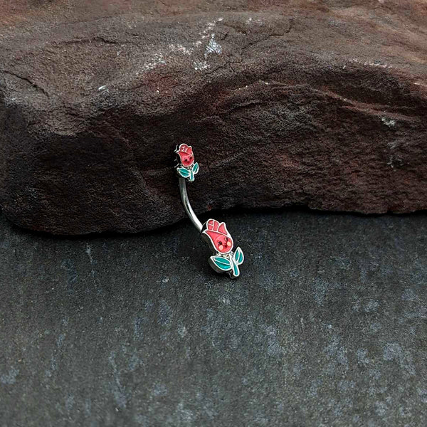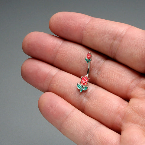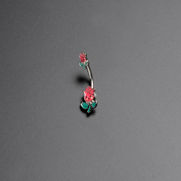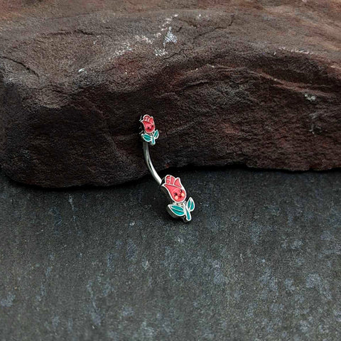 The roses on this 14 gauge navel ring look delighted to be adorning your piercing! It's made with a 3/8" durable 316L surgical grade stainless steel curved barbell. Each of the ends features a rose flower charm, with a red inlaid blossoms and green inlaid leaves and stems. They also feature cheerful faces on the blossom portions, for a truly winsome touch. Rise to every occasion with with this endearing floral belly piercing jewelry!