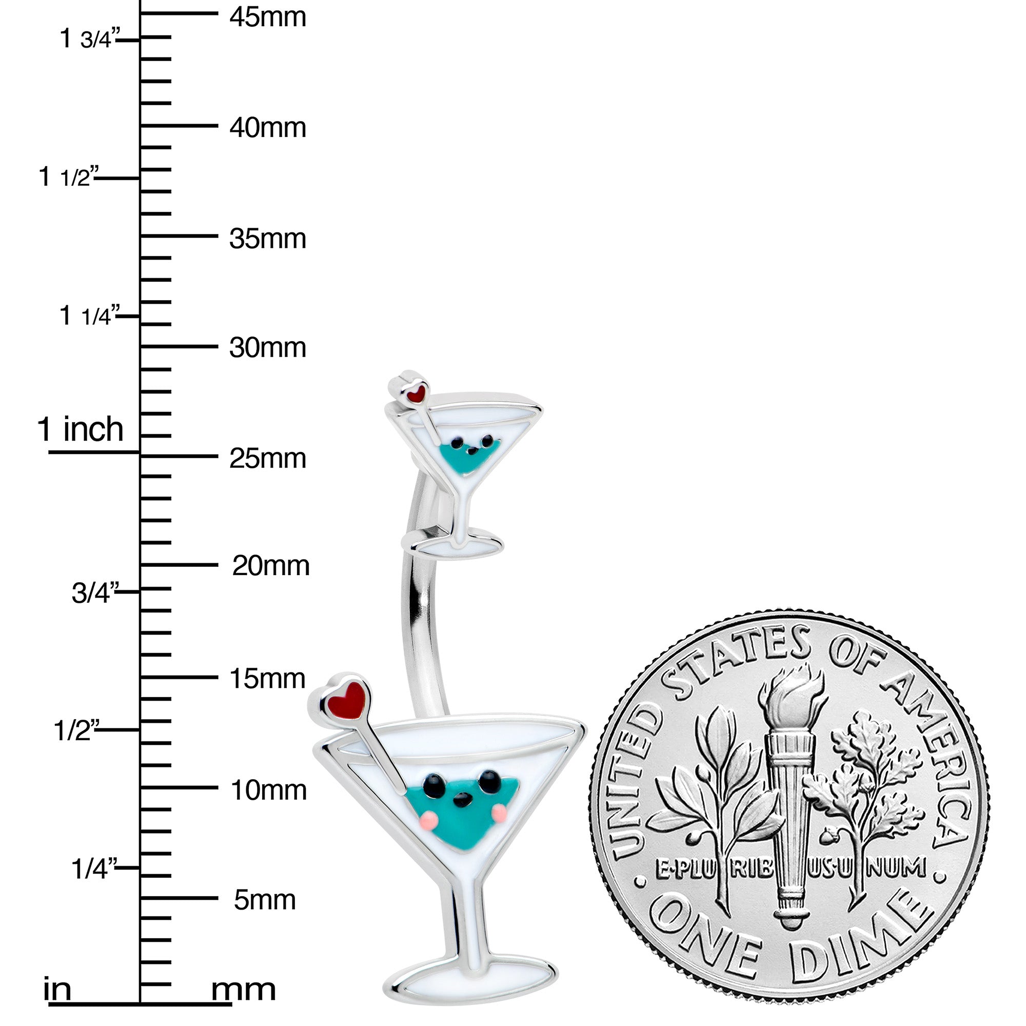 Bottoms up for style, with this 14 gauge navel ring! It's made with a 10mm durable 316L surgical grade stainless steel curved barbell. Each of the ends features a martini glass charm, with blue embellishment and a heart-ended swizzle stick. They also features faces on the glasses for added sweet style. Drink in the compliments when you're rocking this cocktail-themed belly piercing rings!