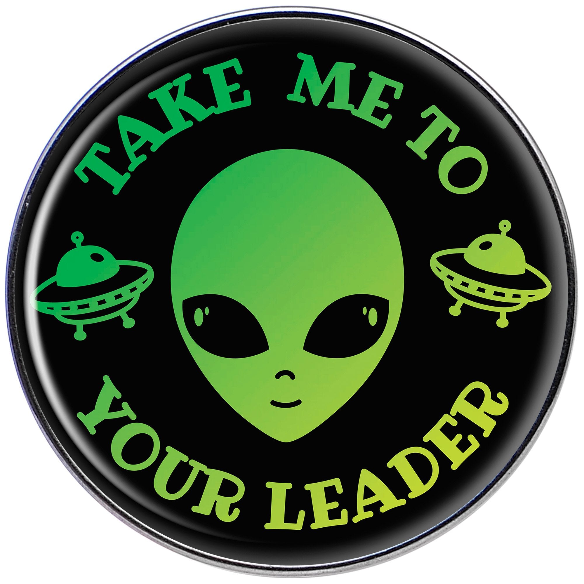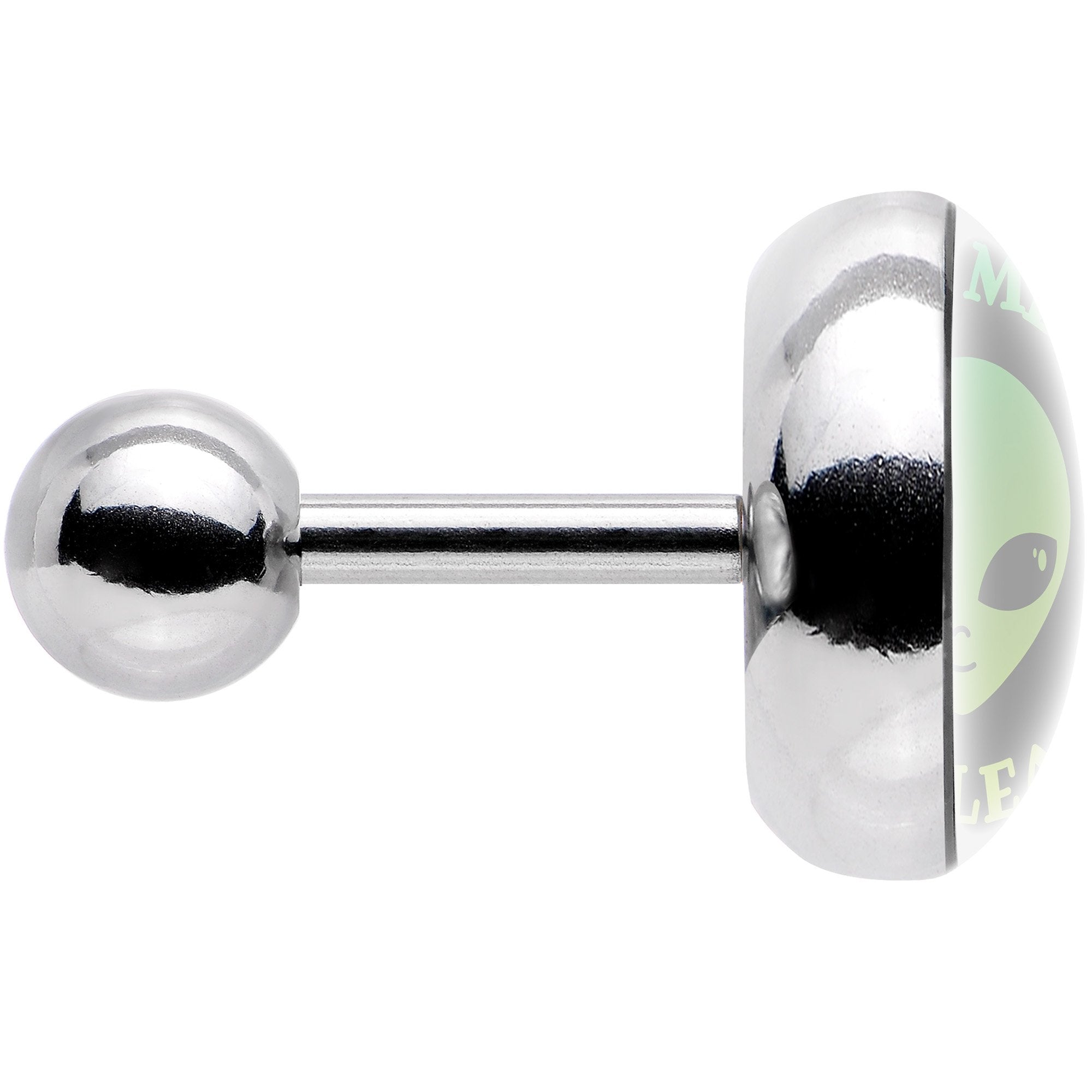 If you love all things alien then this 16 gauge cartilage jewelry is right for you! Made with a 1/4" durable 316L surgical grade stainless steel straight barbell, this tragus earring features a green alien with UFOs that says Take Me To Your Leader on a black background logo inlay.