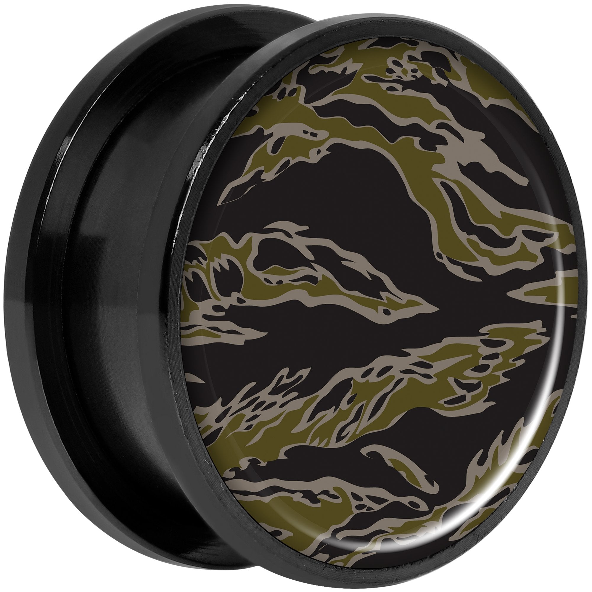 If you love a black and green tiger camo pattern then this pair of double flare plugs is right for you! Made with black anodized over 316L surgical grade stainless steel, these 13/16" ear gauges are made with a screw fit design for easier insertion and removal and are sold as a set of two for you.
