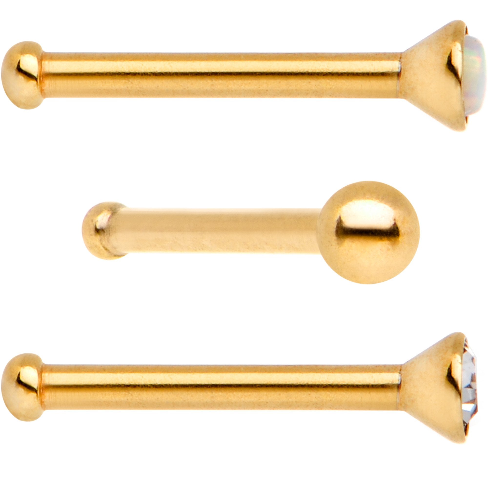 Make sure you have options for your pierced nose with this set of 3 nose rings in the nose bone design. These 20 gauge nostril rings have a length of 1/4" and are made from gold PVD over 316L surgical grade stainless steel. Included in this package of 3 nostril rings are a nose piercing with a white synthetic opal top, a clear cubic zirconia gem top, and a plain ball end. These nose bone piercings are sold as a set of three.