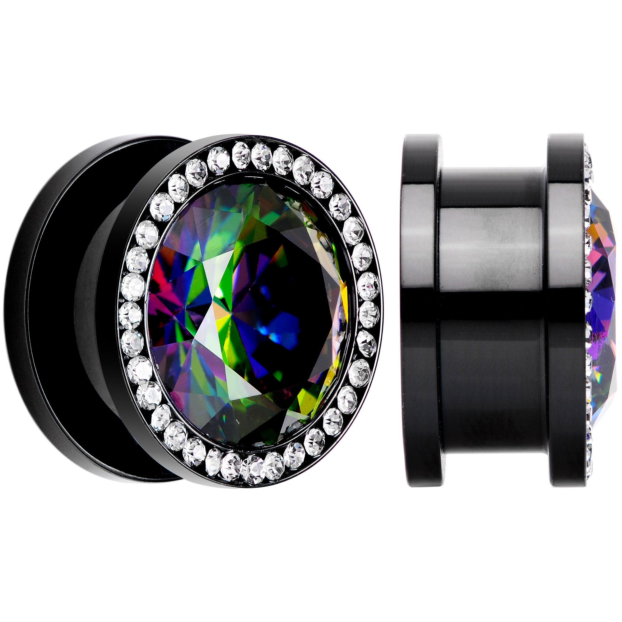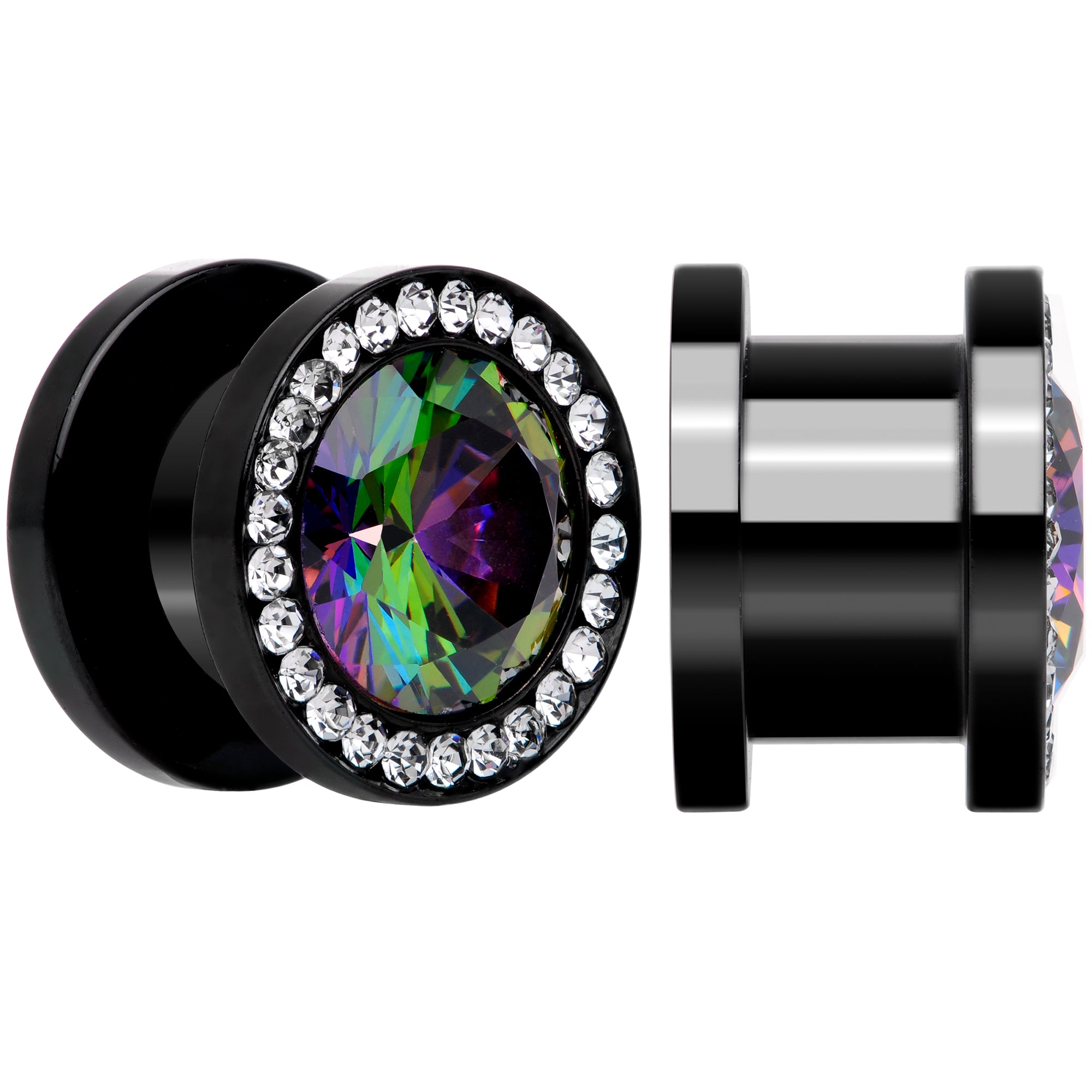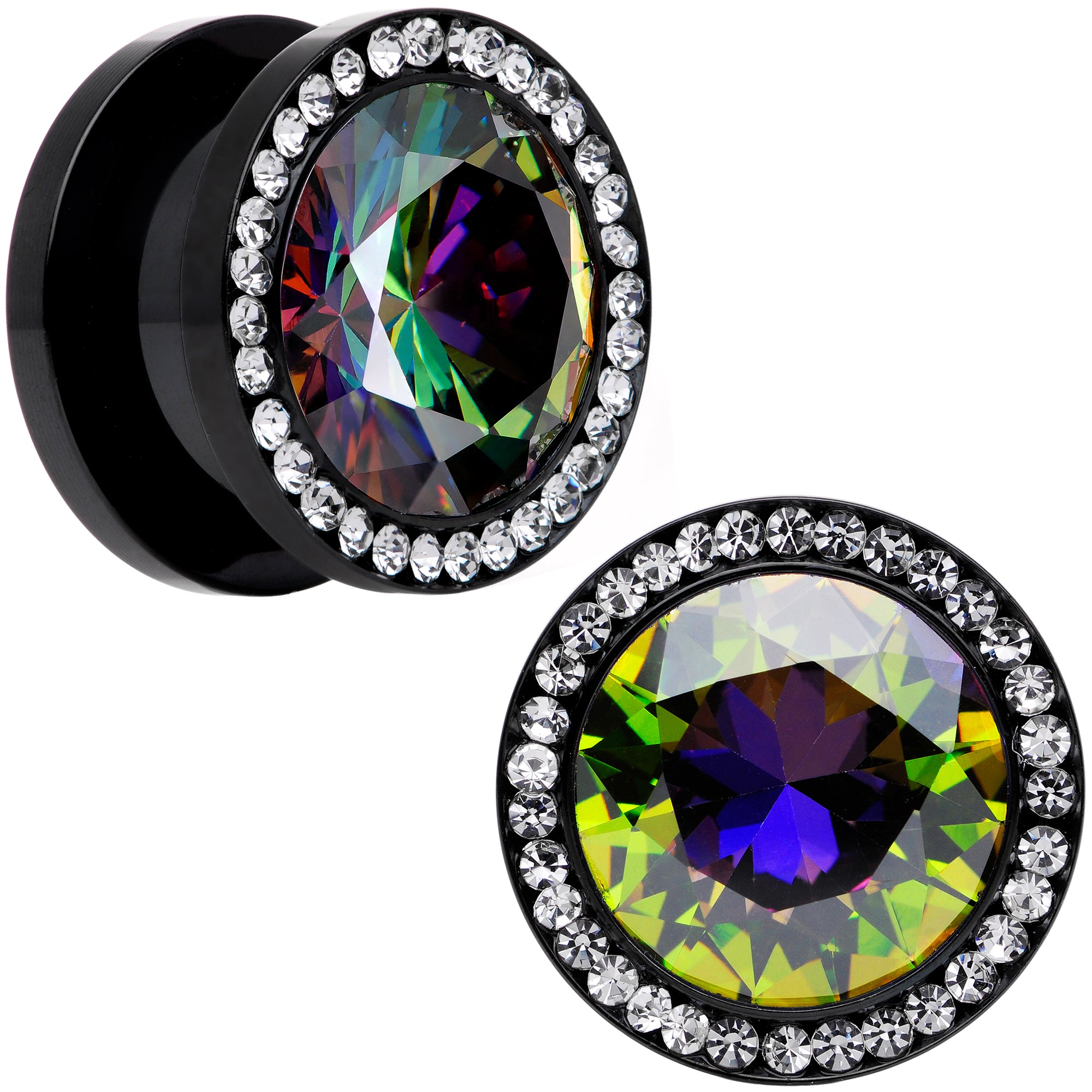 You'll be rockin' around the rainbow with these stunning multi-tonal plug earrings! These ear gauges are made with black plated over 316L surgical grade stainless steel. The front flare is paved in clear cubic zirconia gems, encircling a large vitrail gem. The multicolor shift of the vitrail adds a blast of color that perfectly offsets the black ear gauges and the screw fit design makes them super easy to insert and remove. All those shifting colors....you'll be hypnotized! Sold as a set of two.