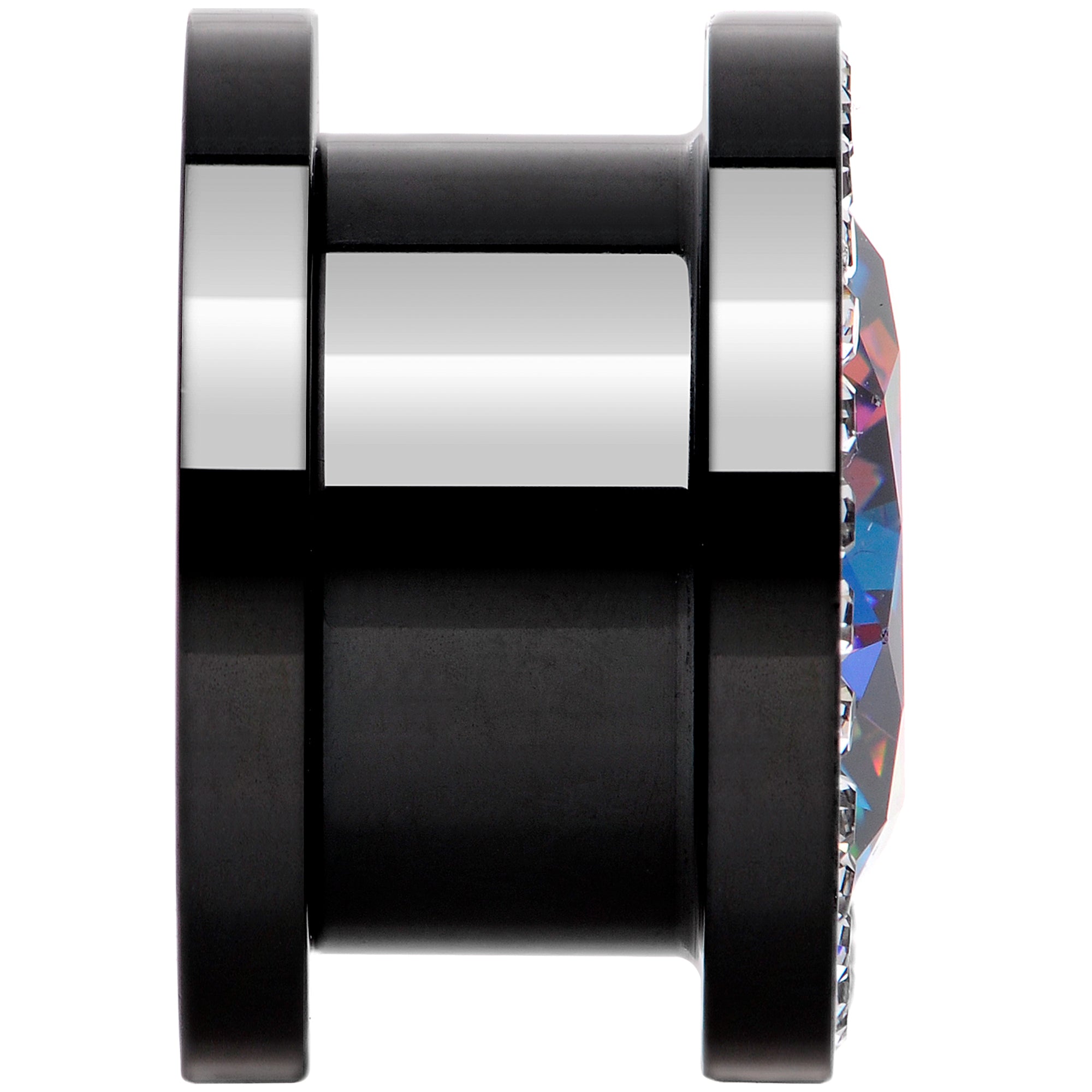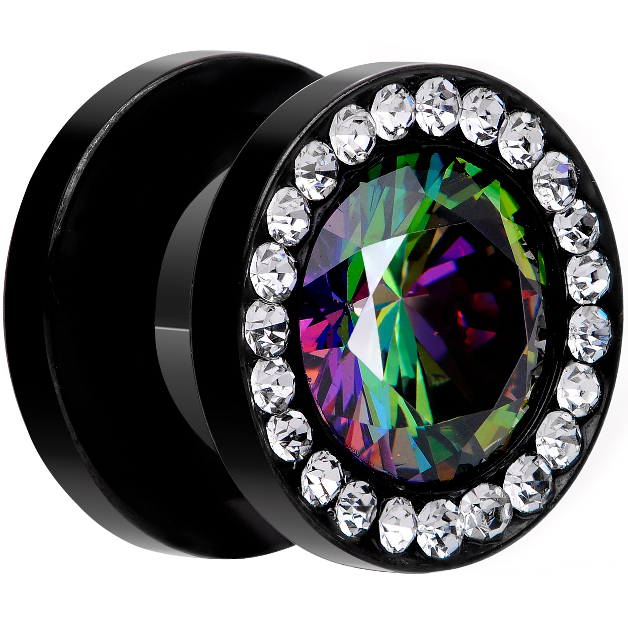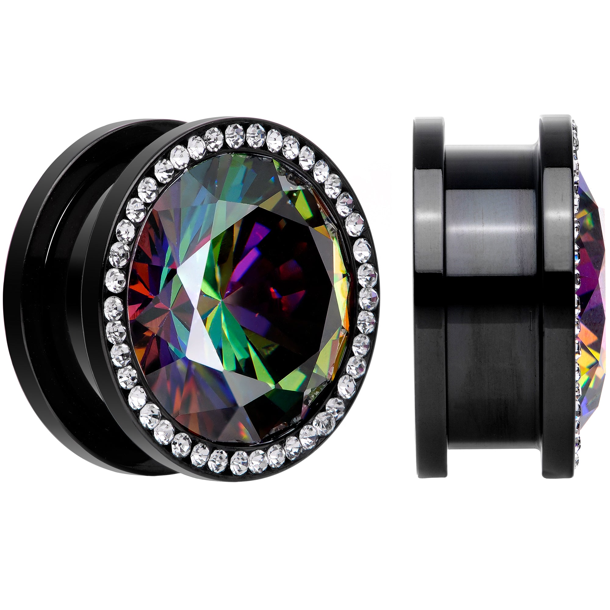 You'll be rockin' around the rainbow with these stunning multi-tonal plug earrings! These ear gauges are made with black plated over 316L surgical grade stainless steel. The front flare is paved in clear cubic zirconia gems, encircling a large vitrail gem. The multicolor shift of the vitrail adds a blast of color that perfectly offsets the black ear gauges and the screw fit design makes them super easy to insert and remove. All those shifting colors....you'll be hypnotized! Sold as a set of two.
