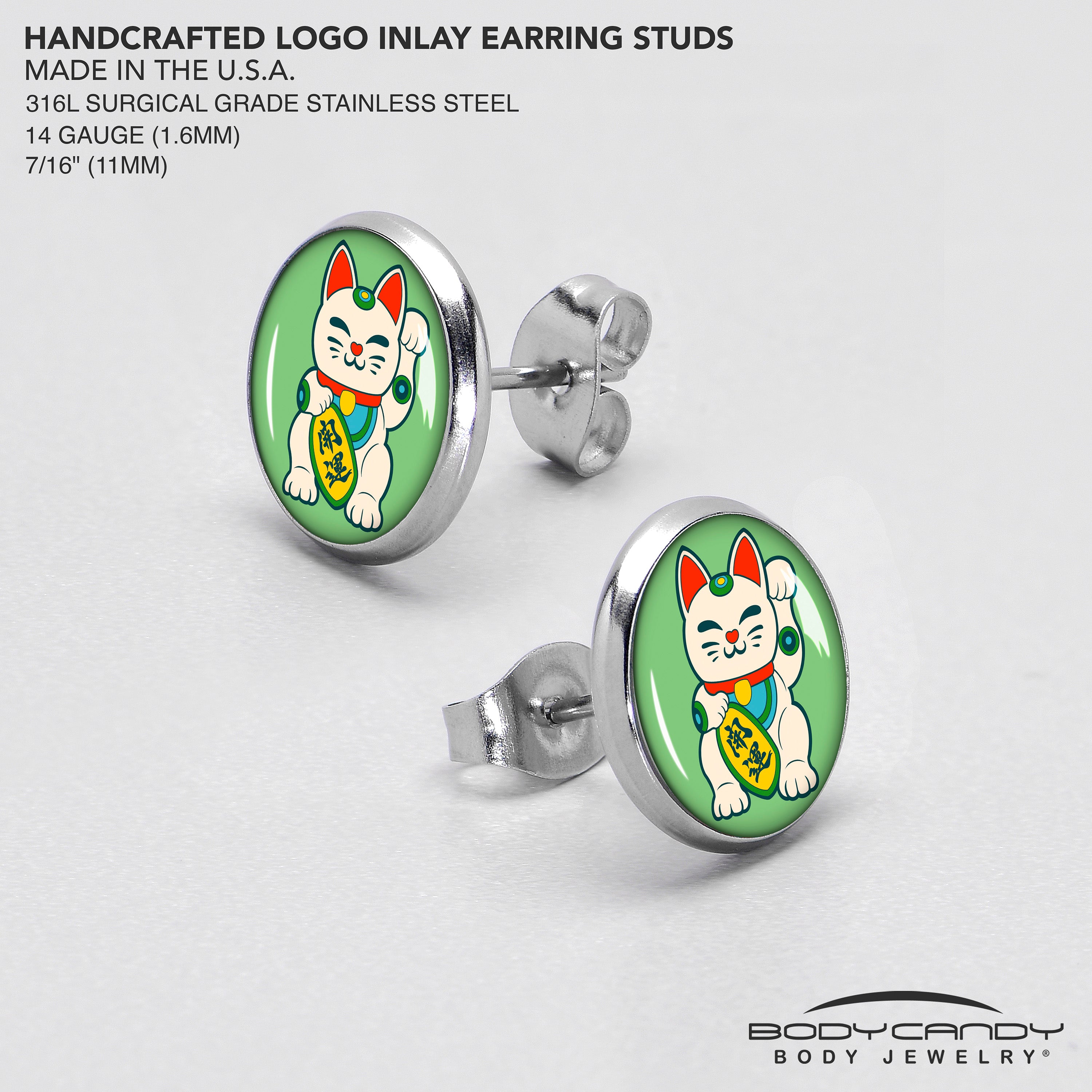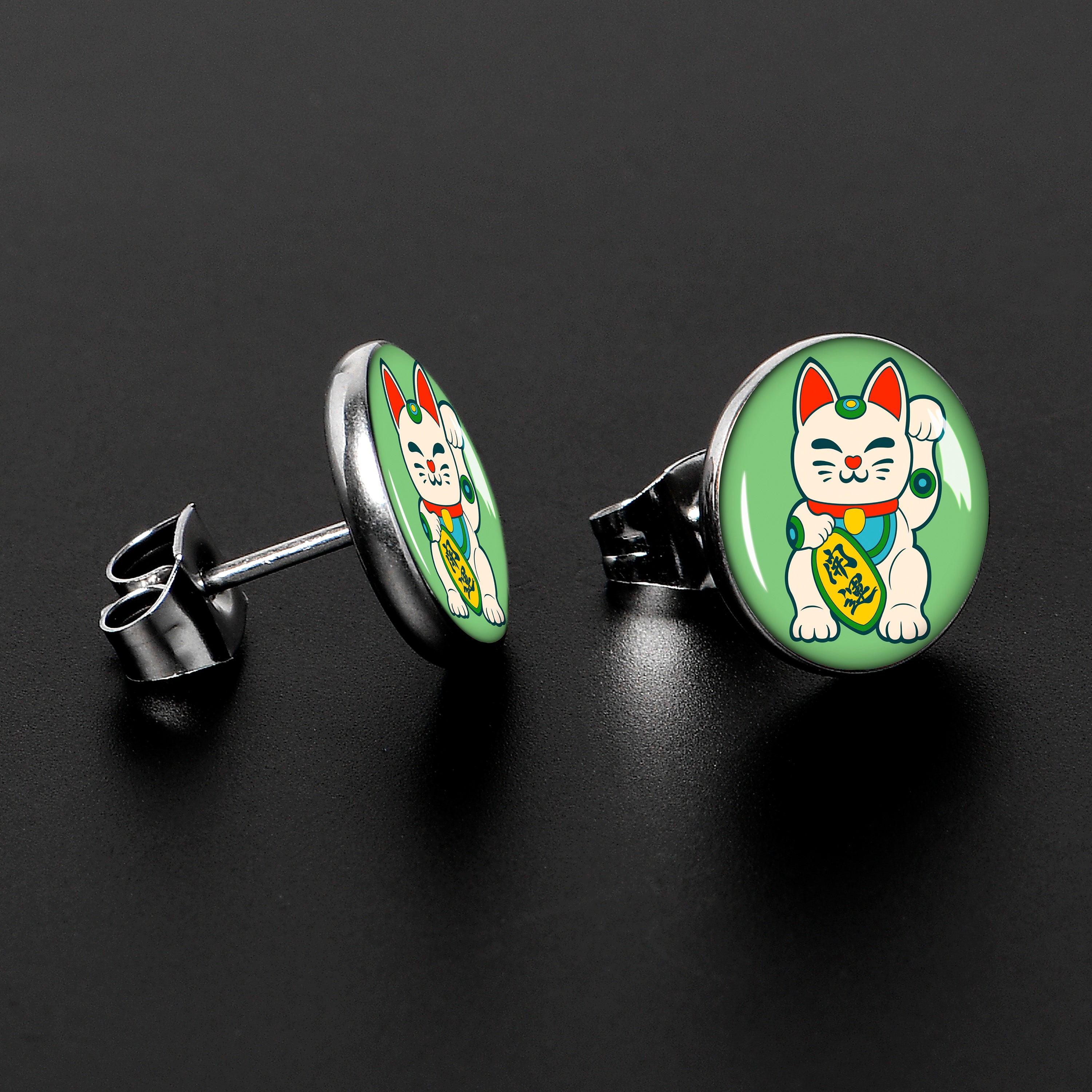 You will be feeling super lucky when you have on these earrings for pierced lobes. They are made with stainless steel straight posts with friction backs for a secure fit. The front ends each feature a green disc with a Maneki-neko lucky cat on it. The cat is white with red embellishment and has one paw up in the air for its traditional wave. This waving cat will make you feel like you have lucked into some elegant style on these pierced stud earrings. Sold as a set of two.