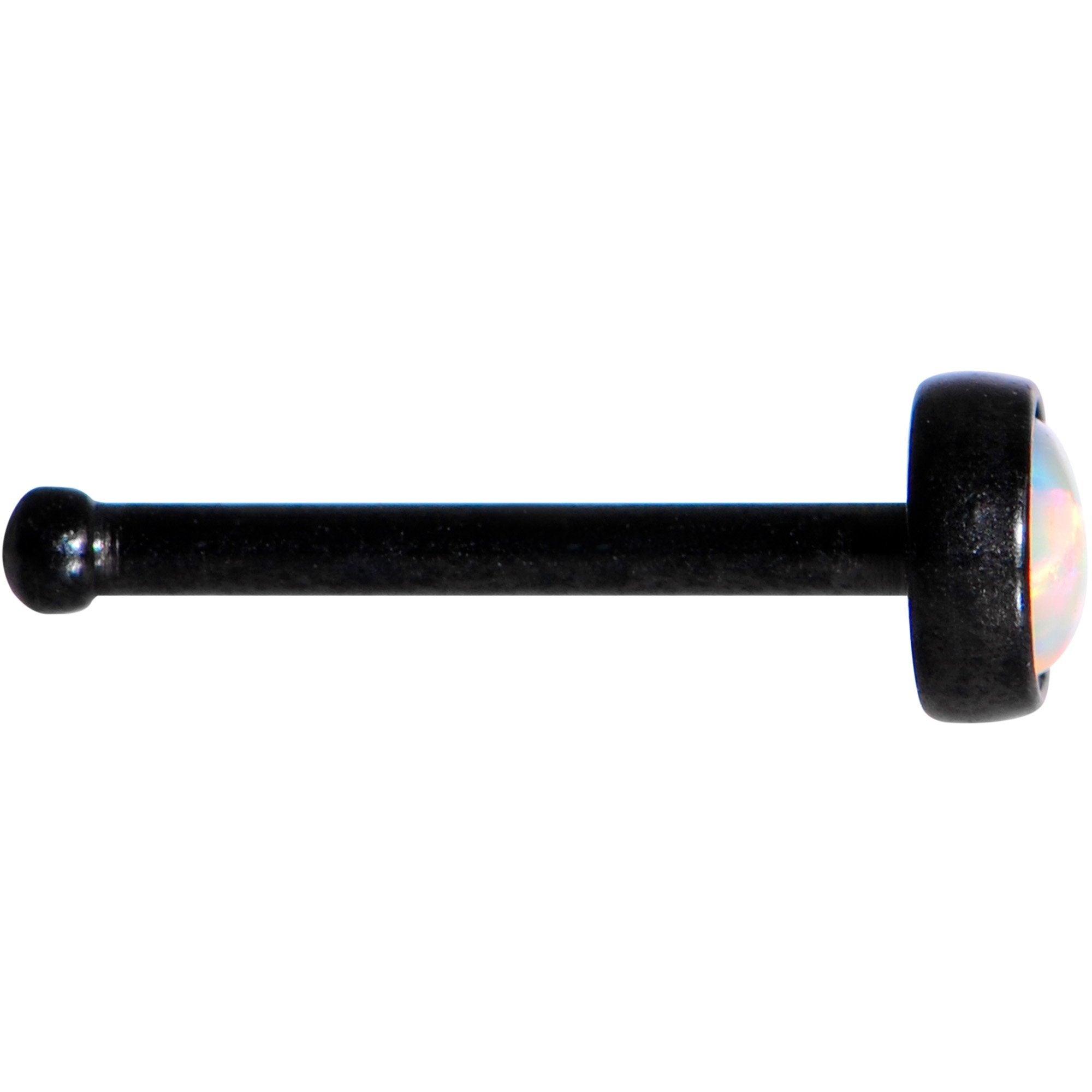 The look of iridescent opals is so in right now, especially in the world of body modifications. This 20 gauge nose ring puts the beauty of a 3mm white synthetic opal on display at the end of its 1/4" length post made from black anodized over 316L surgical grade stainless steel. This nose bone features a bulbous end that is suitable to push through fully healed nose piercings for a snug and secure fit.