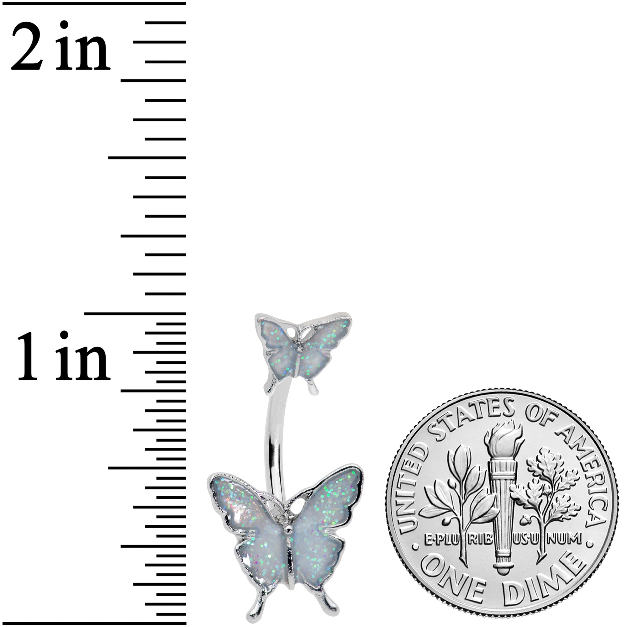 Double your style with this 14 gauge navel ring! It's made with a 3/8" durable 316L surgical grade stainless steel curved barbell. The top end features a butterfly charm, with white inlaid wings. The wings are further embellished with tiny flecks of glitter for an extra touch of style. The bottom end features a matching butterfly, further embellished with white and glitter wings. Get twice the style with this marvelous, matching butterfly belly button jewelry!