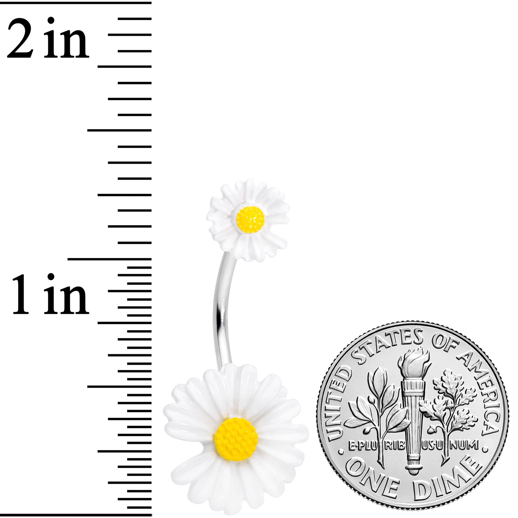 Let the daisies on this 14 gauge navel ring bedeck your piercing in colorful style! It's made with a 3/8" durable 316L surgical grade stainless steel curved barbell. The ends each feature a three-dimensional white daisy charm, with one end larger than the other. The flowers also feature textured centers in yellow for extra contrast. Your belly button piercing will blossom with these delicious daisies in it!