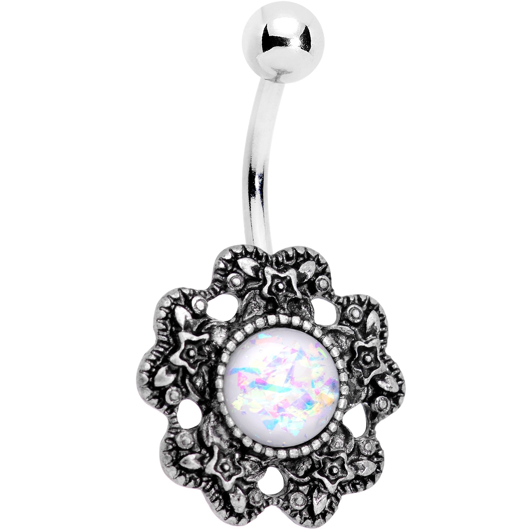 This floral-inspired navel piercing is a definite must-have if you're looking for something simple and sexy for any outfit. Made with a 7/16" surgical grade stainless steel curved barbell, this belly button ring features a flower bottom charm that frames a single white faux opal that will draw all the best attention and make a glamorous addition to any navel jewelry collection.