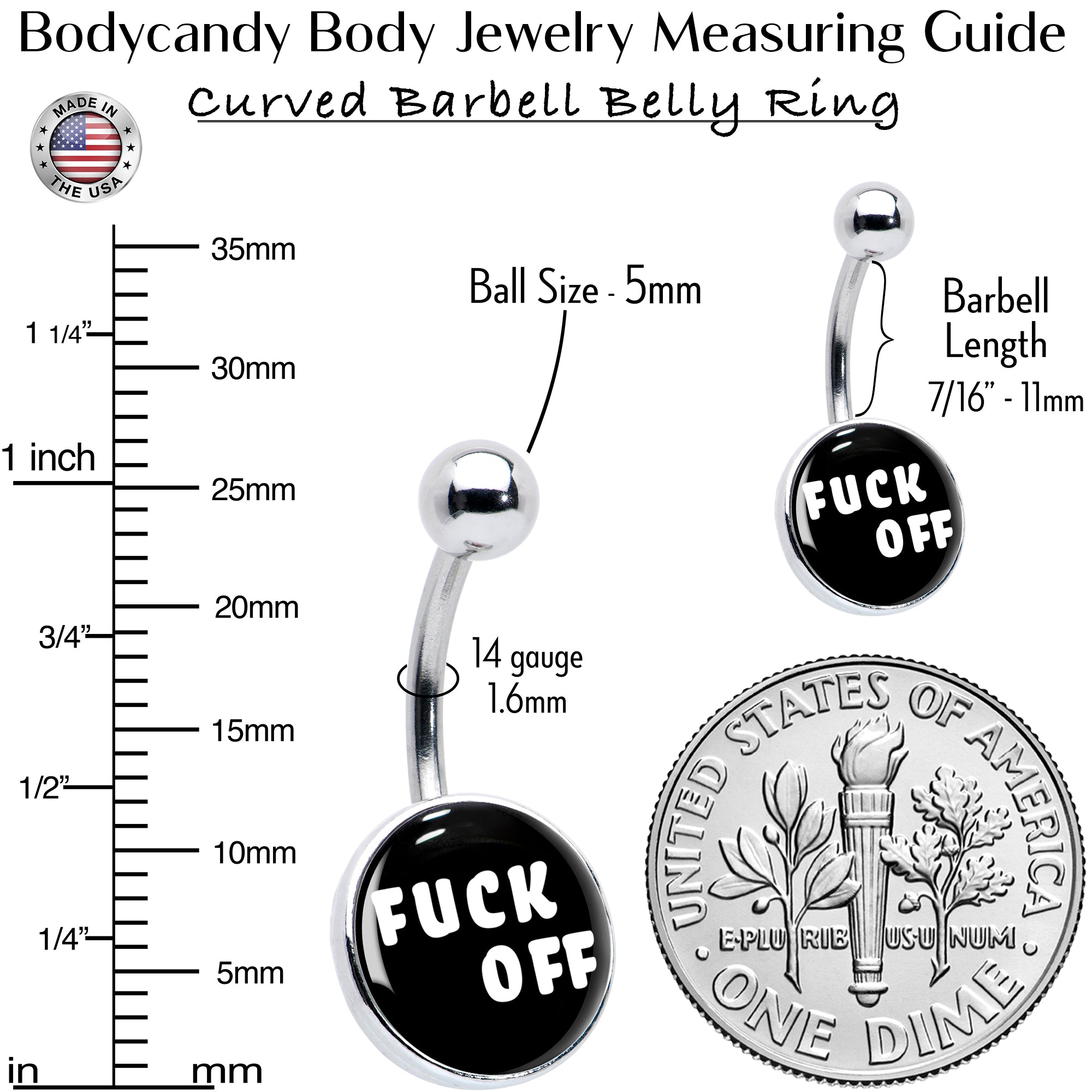 Say what you mean and mean what you say with this 14 gauge navel ring. It is made with a 7/16 inch 316L surgical grade stainless steel curved barbell with a 5mm top ball end. The bottom end features a disc shaped charm that features a logo inlay of a black background with a Fuck You message in all capital letters. Let the world know when to stay away with this charmingly blunt belly piercing ring.
