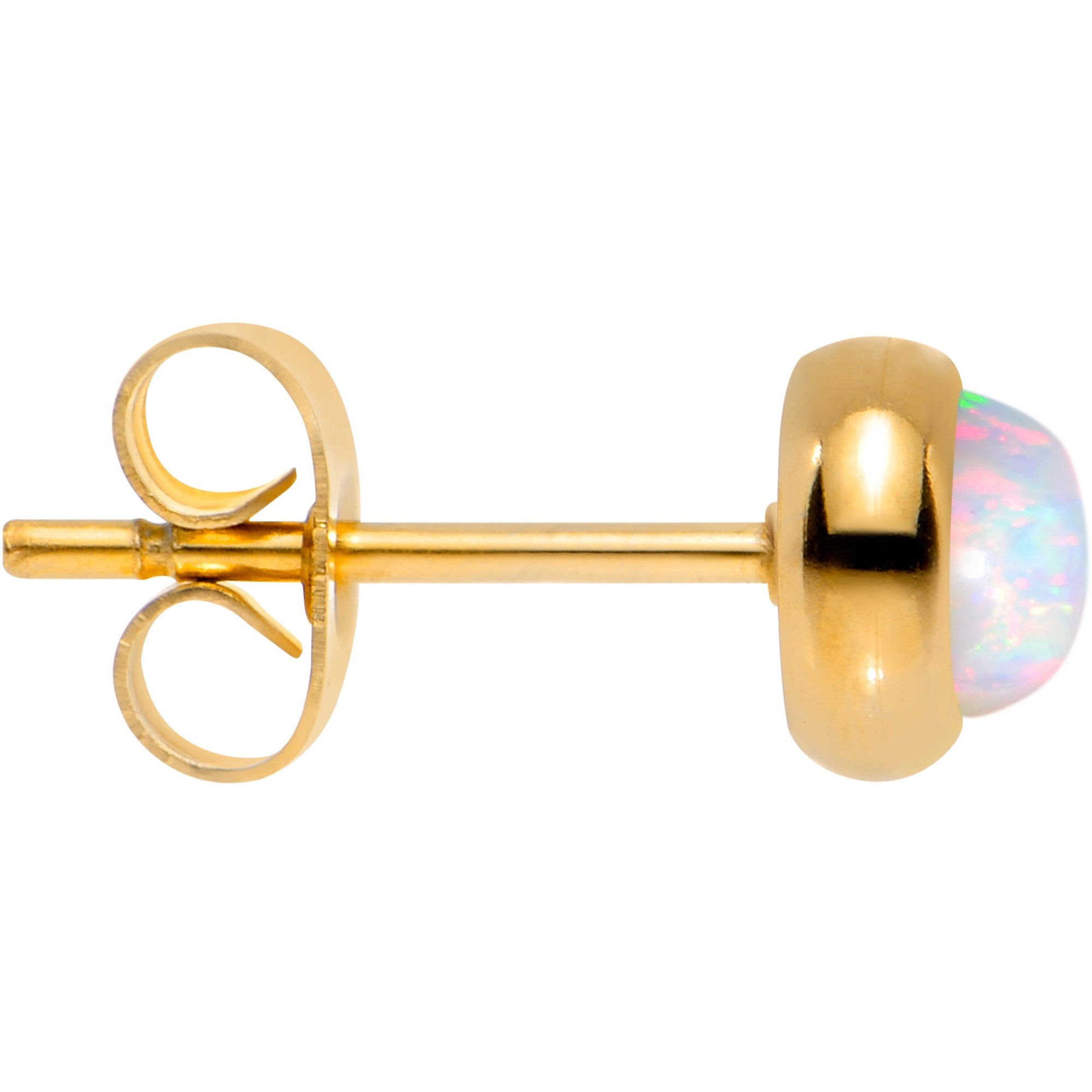 Show off your love of color and cool style when you wear this pair of pretty fashion earrings. Made with gold IP over 316L surgical grade stainless steel posts with friction backings, these 6mm diameter earrings for women feature white synthetic opal inlays.