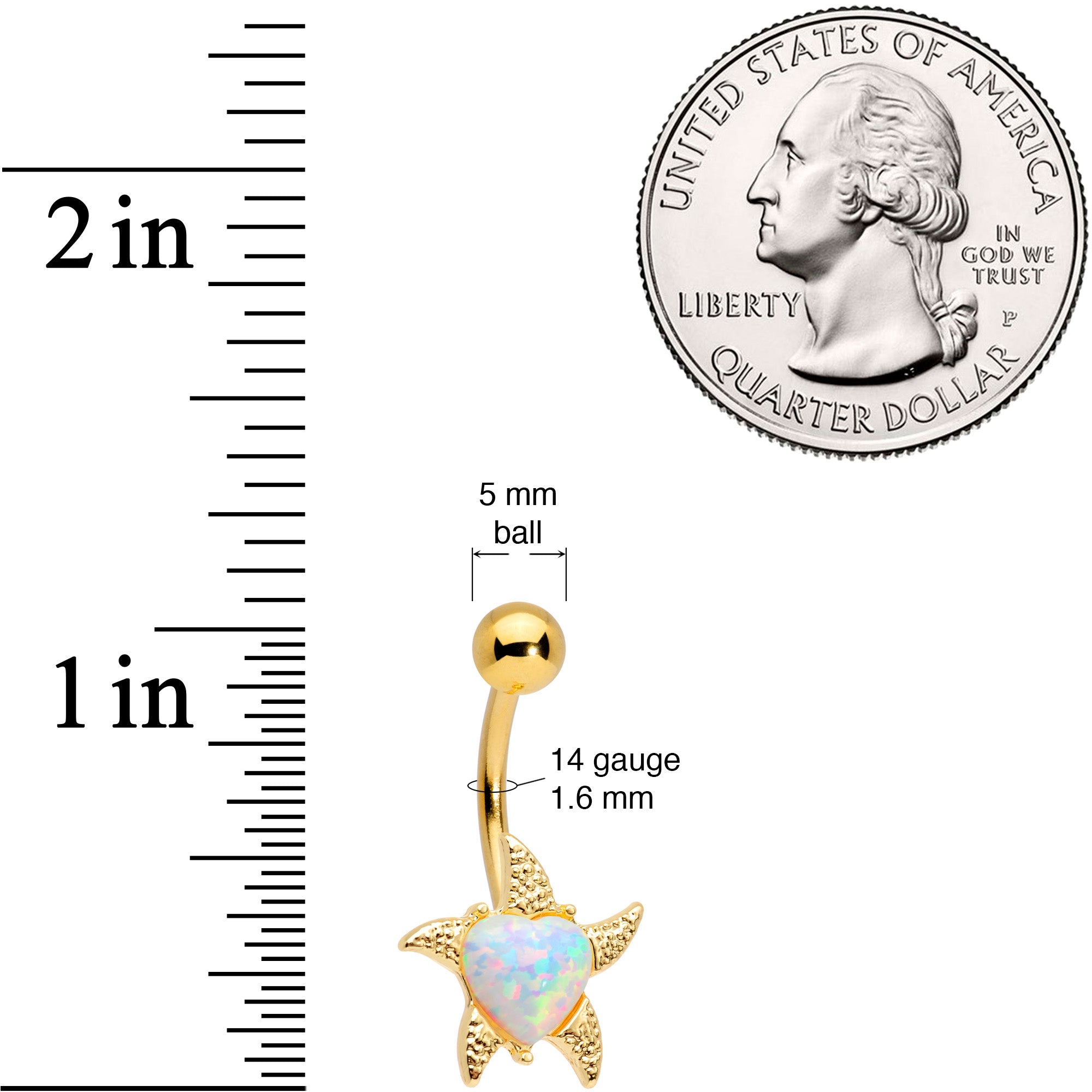 If you've got a soft spot for sea life this nautical navel jewelry will sweep you away like a tidal wave! The 14 gauge belly button ring is made with a 3/8" gold tone plated over 316L surgical grade stainless steel curved barbell with a 5mm top ball end. The bottom end features a starfish charm set at its center with a heart-shaped white synthetic opal. Whether you're bound for the beach or obsessed with the ocean, this is a star you'll want shining in your navel piercing!